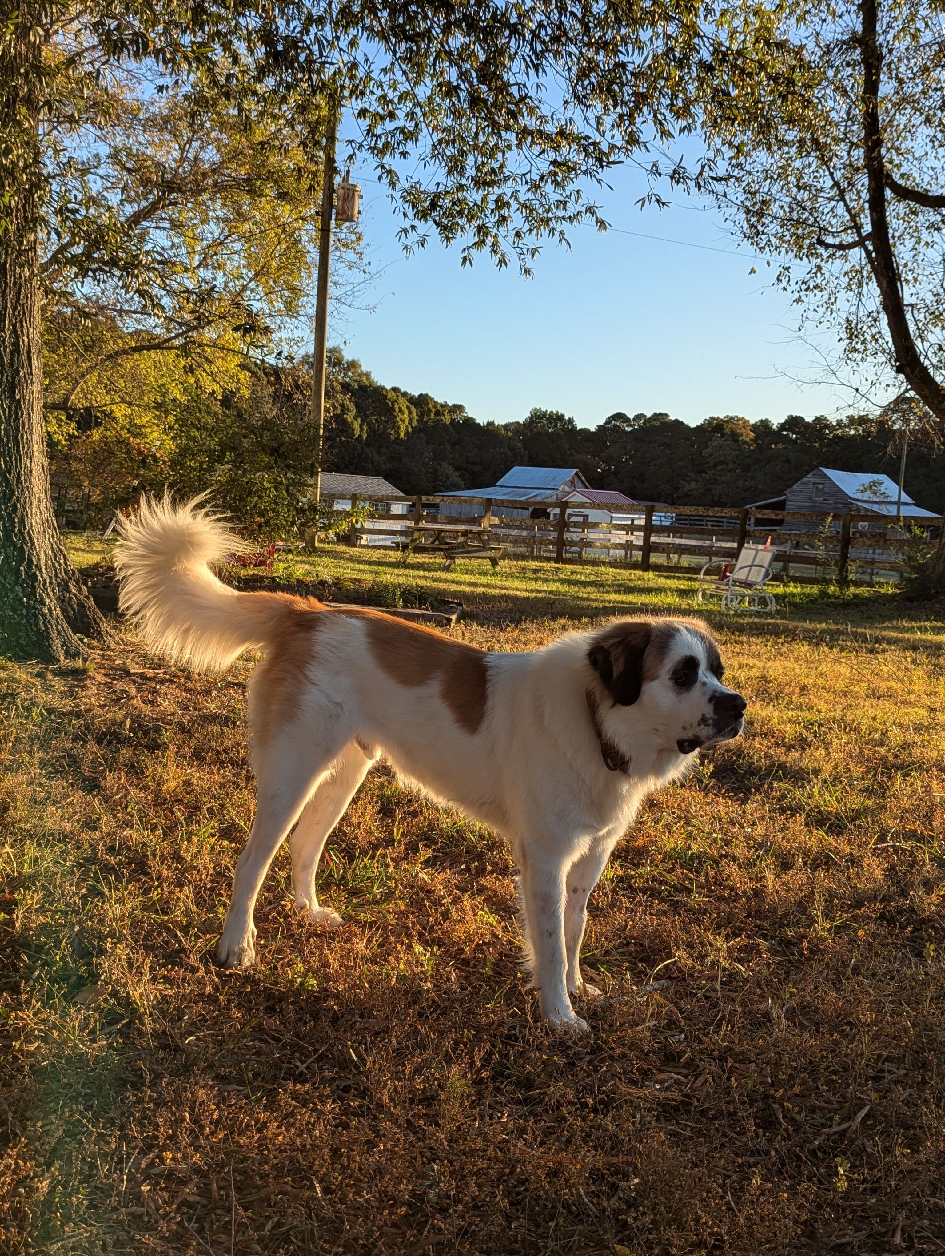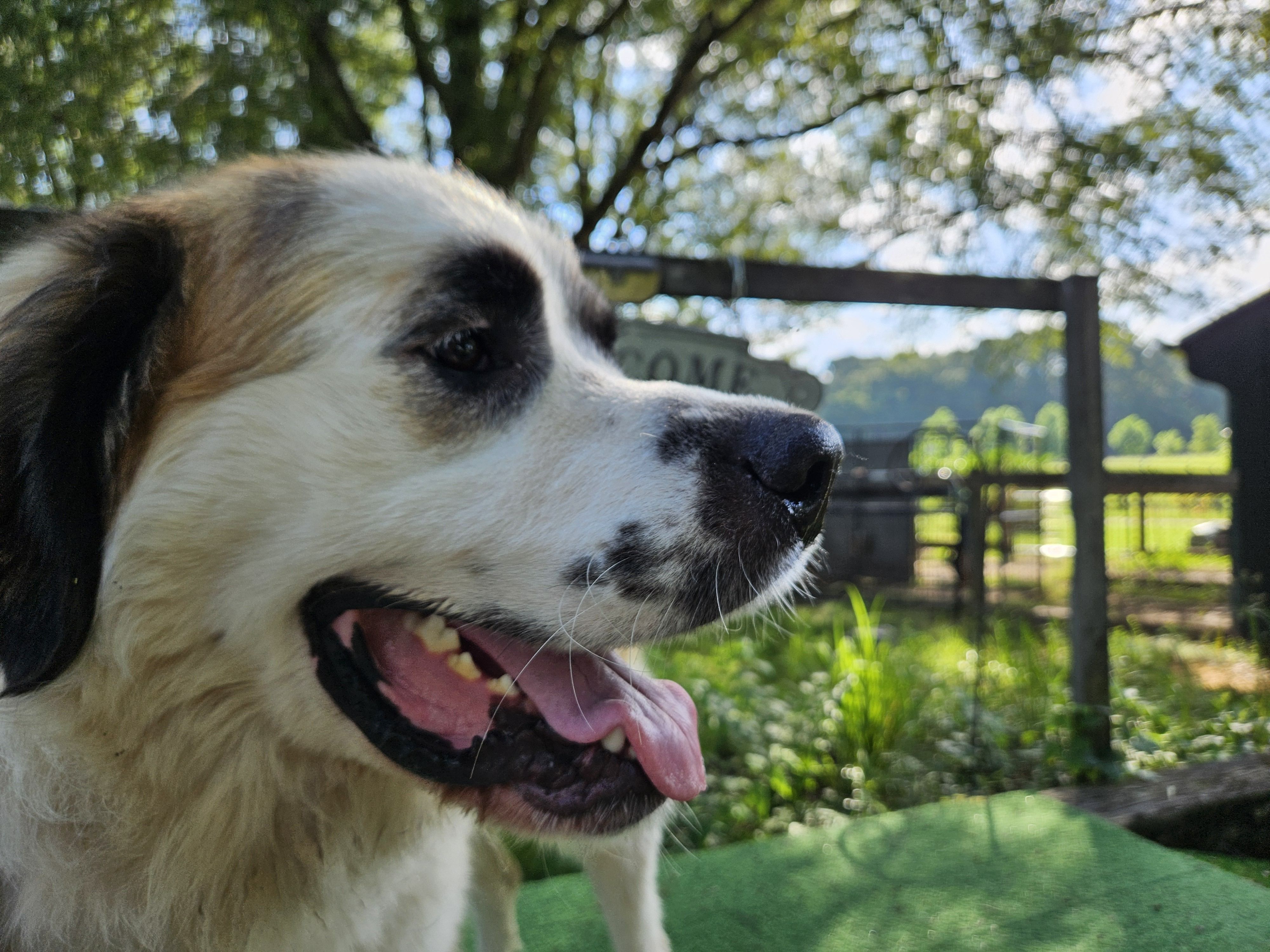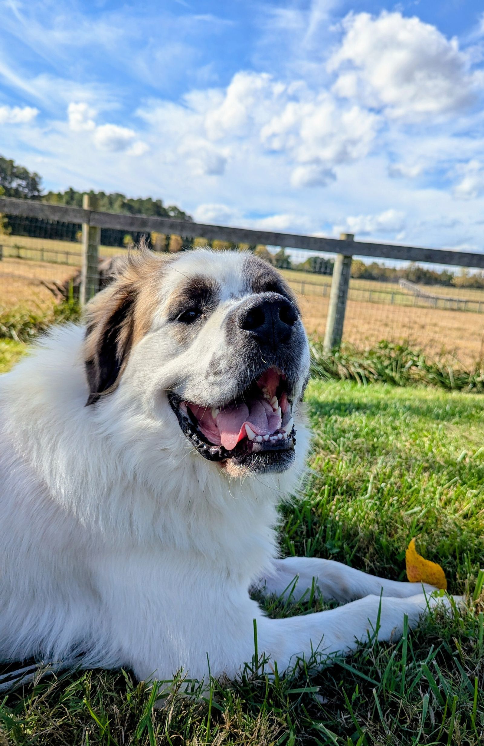 Cash was pulled directly by us from a rural dog shelter in SW Virginia. They do a great job in networking their dogs to get them into safe rescues, etc as well as adopting out. I saw Cash's picture and I immediately fell in love. With Colton being 50% St Bernard and loving the Great Pyrenees as a guardian for the farm, what would be an amazing combo - a St Bernard/Great Pyrenees. I always try to help dogs that don't get immediately pulled so I waited a few days. With trying to adopt Arizona out, it wasn't necessarily the best time to welcome another dog but my gut was saying I had to help him. And so I did. When he got off the transport truck, we met several hours away, he melded into me like we had known each other our whole lives. (The shelter has described him as the friendliest dog they had had in the last 3 years) And that he was. When we got home, he felt home and immediately became besties with Cooper as they could romp around together. He immediately took to Colton as well and both Cooper and Colton loved him back. He has done so well his first 3 months here, learning the ropes of sanctuary life. And when I say he has my back, he does. This boy hears everything and is always alerting me of everything he thinks I need to know about. We are still introducing him to all the animals on the farm. We want him to learn Colton's way. We have gotten him neutered, he is gaining weight and that coat is so soft now. We love him so much.