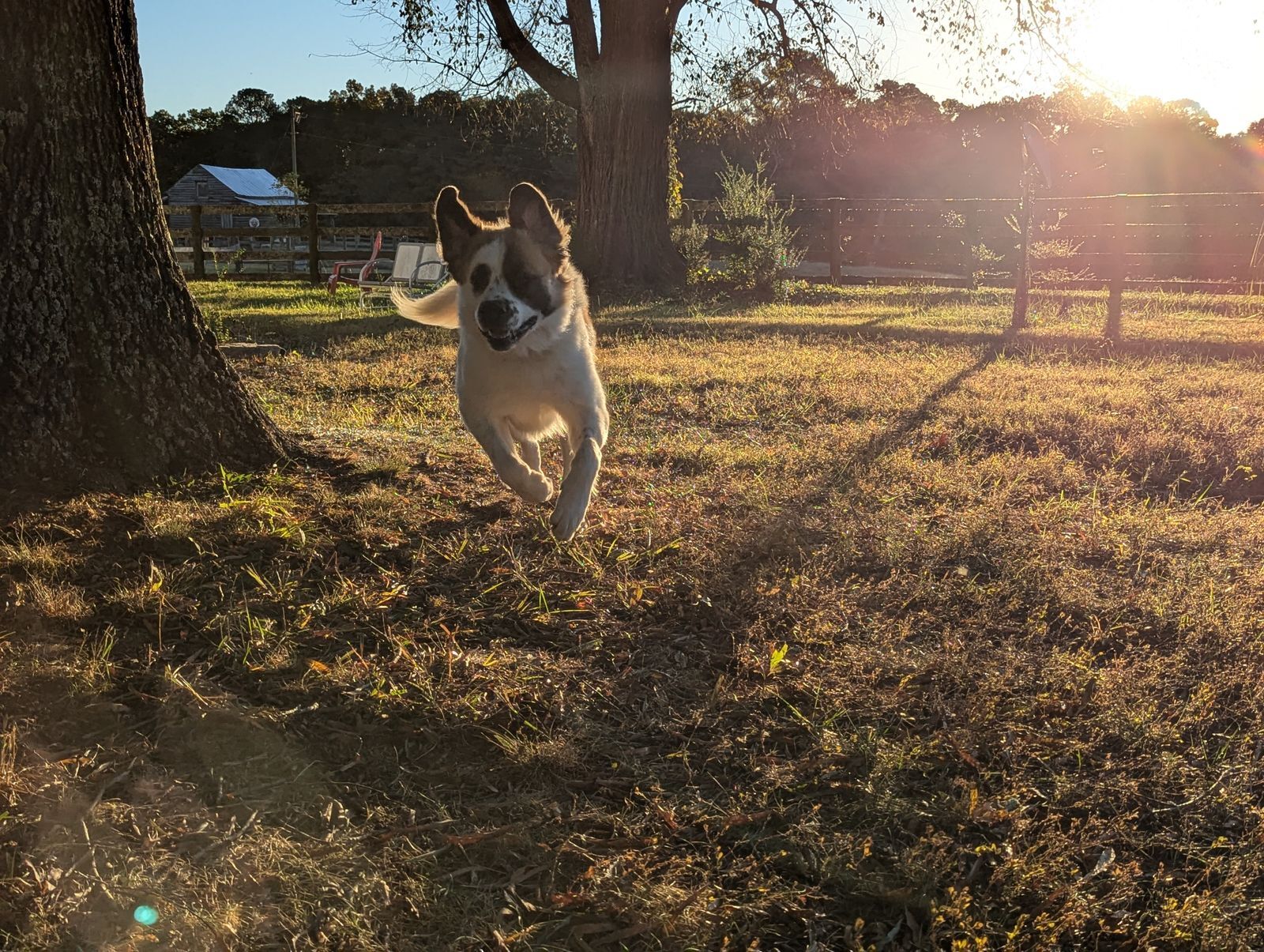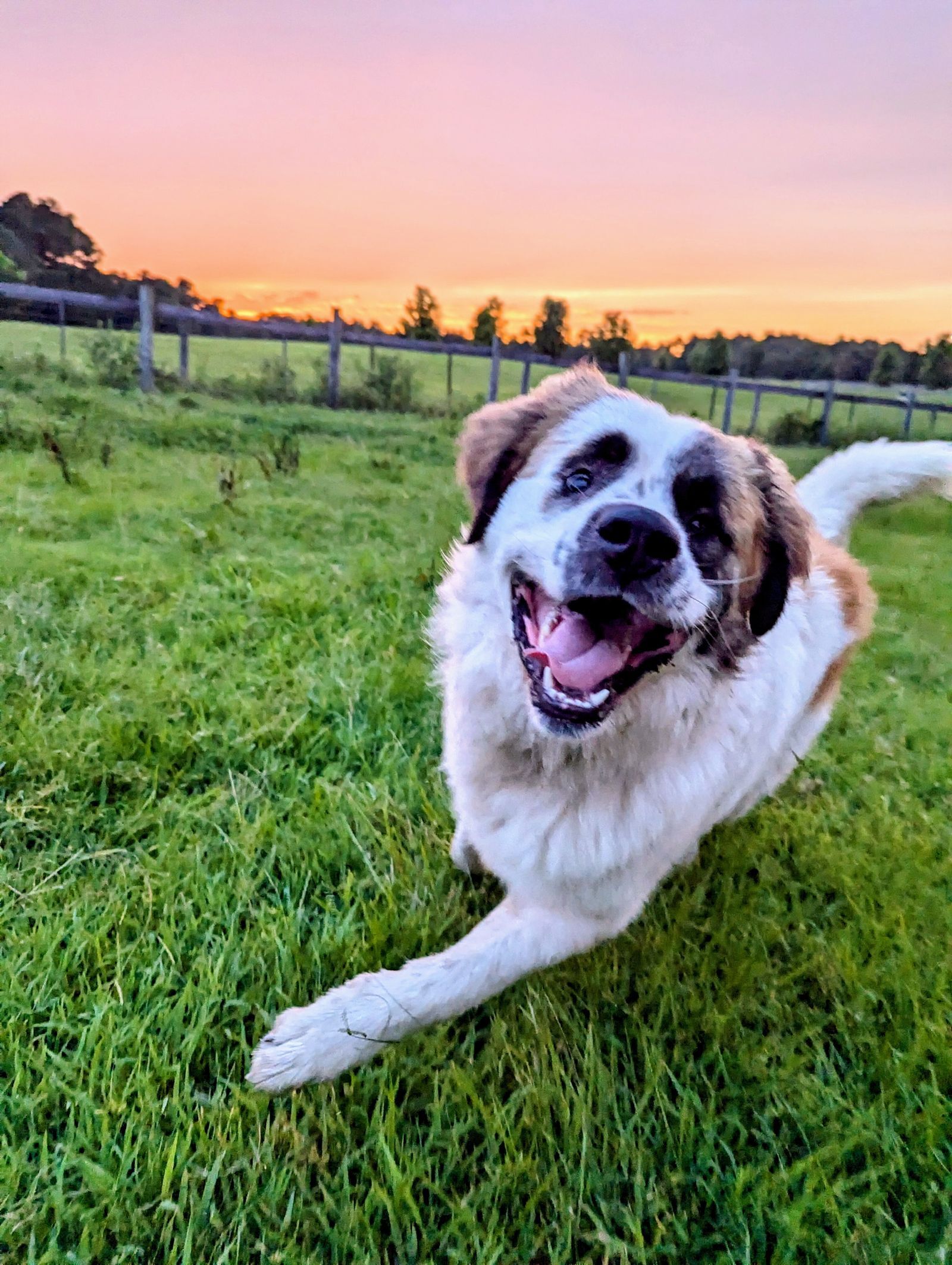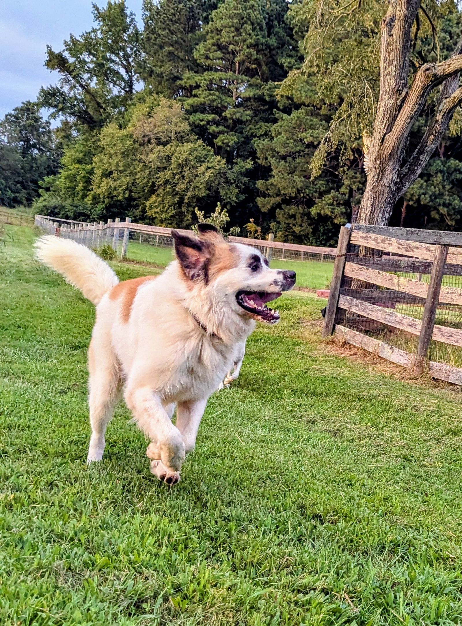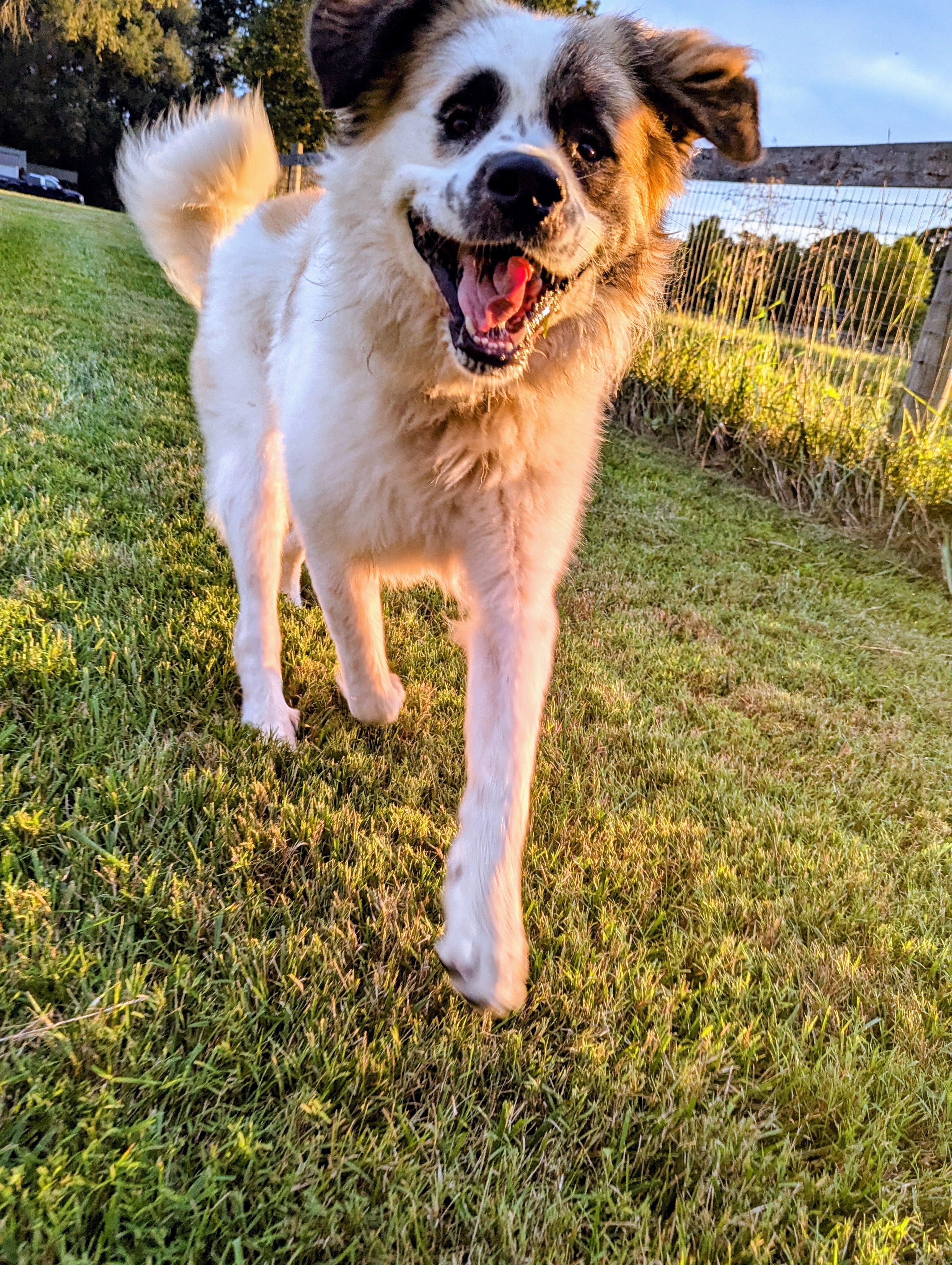 Cash was pulled directly by us from a rural dog shelter in SW Virginia. They do a great job in networking their dogs to get them into safe rescues, etc as well as adopting out. I saw Cash's picture and I immediately fell in love. With Colton being 50% St Bernard and loving the Great Pyrenees as a guardian for the farm, what would be an amazing combo - a St Bernard/Great Pyrenees. I always try to help dogs that don't get immediately pulled so I waited a few days. With trying to adopt Arizona out, it wasn't necessarily the best time to welcome another dog but my gut was saying I had to help him. And so I did. When he got off the transport truck, we met several hours away, he melded into me like we had known each other our whole lives. (The shelter has described him as the friendliest dog they had had in the last 3 years) And that he was. When we got home, he felt home and immediately became besties with Cooper as they could romp around together. He immediately took to Colton as well and both Cooper and Colton loved him back. He has done so well his first 3 months here, learning the ropes of sanctuary life. And when I say he has my back, he does. This boy hears everything and is always alerting me of everything he thinks I need to know about. We are still introducing him to all the animals on the farm. We want him to learn Colton's way. We have gotten him neutered, he is gaining weight and that coat is so soft now. We love him so much.