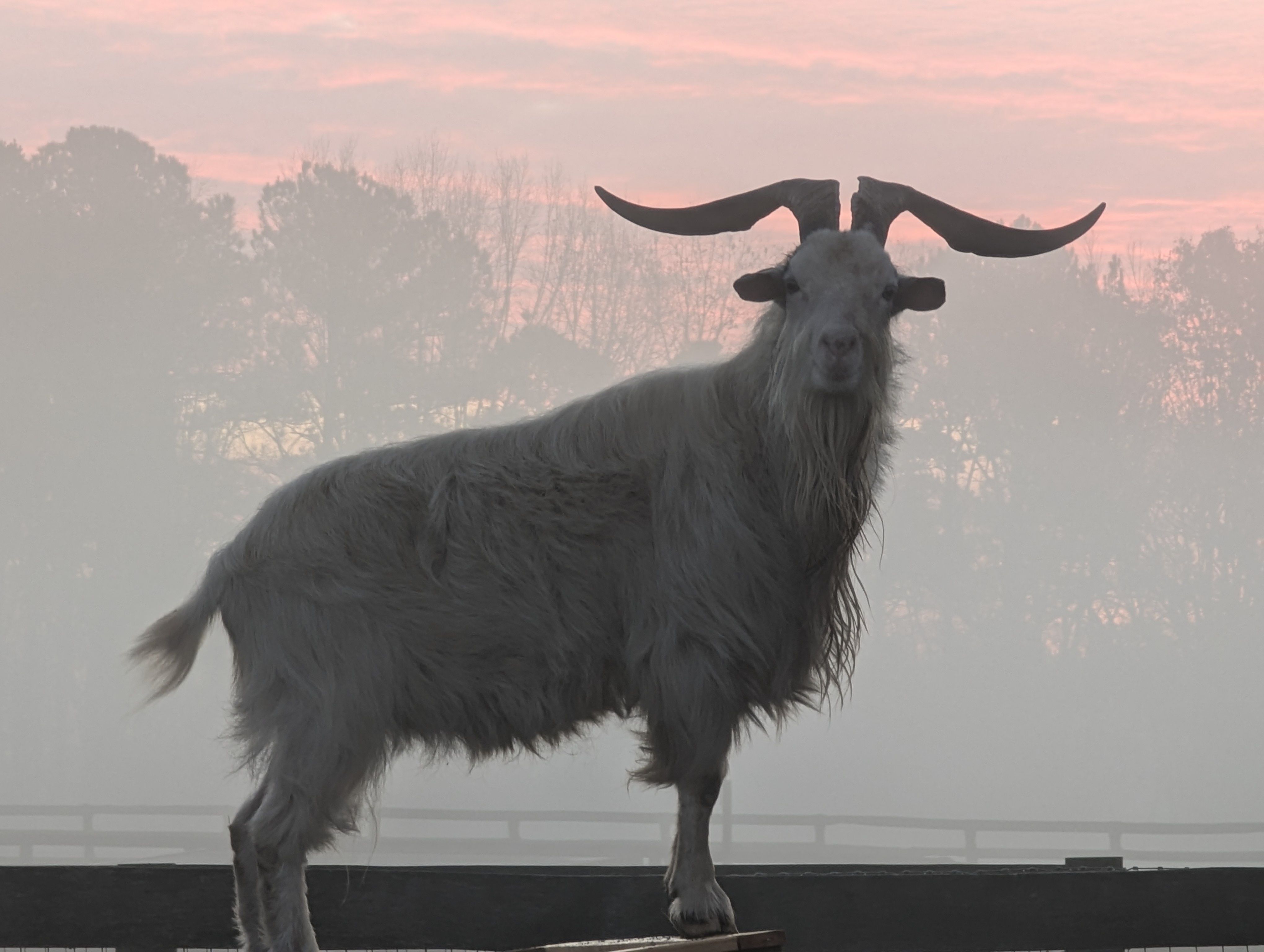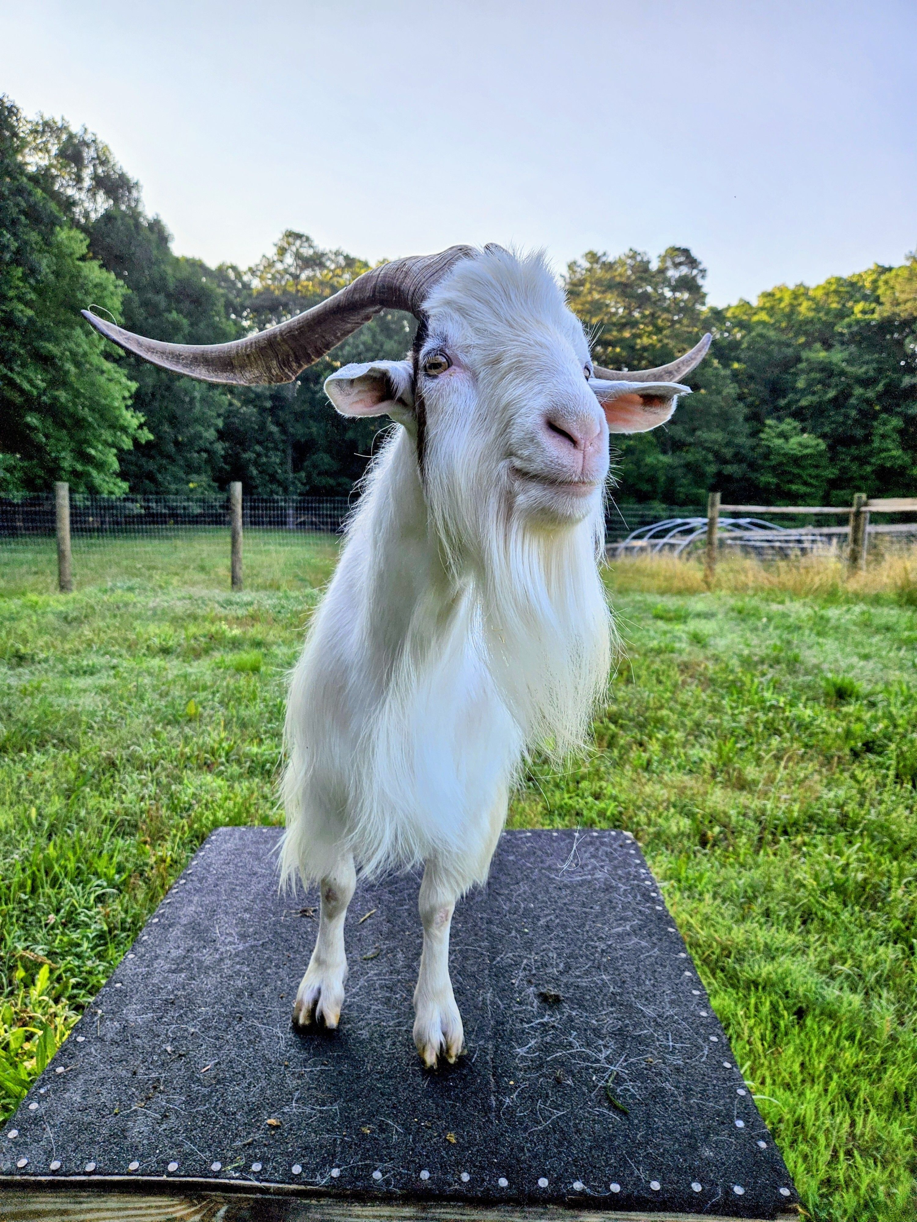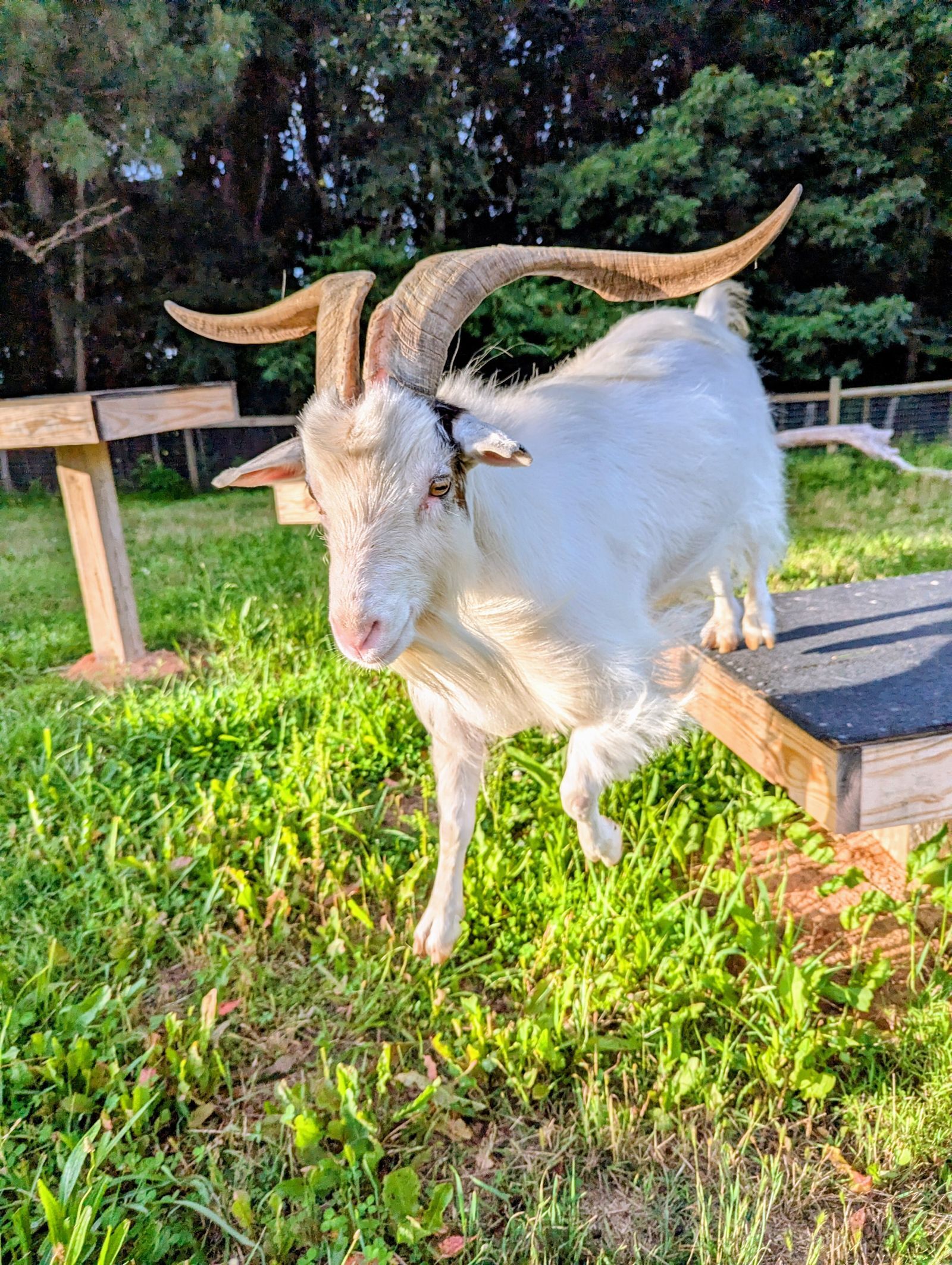 After visiting with him on 12 different days, we were finally able to capture him. You can watch his story below. His story was so compelling that Obi went viral on his 1st Rescuanniversary reaching over a million views and gaining us a lot of Obi followers. After we got him, we got him checked out, he was actually pretty darn healthy, and he got castrated at NC State. After coming home to the sanctuary, we still needed to quarantine him. It was an interesting first few months of him trying to escape here, knocking down fence posts etc. We then tried him with our herd of goats that we thought he would fit best however they are extremely bonded and the boys did not want another boy to join. As sweet as Obi is, when he decides to headbutt, it is with full force and extremely hard. As I know animals will work it out, I couldn't risk anyone getting hurt. And actually one of our goats who had a slightly compromised horn had it crack even more. He is okay but it would not be good for his horn to continue to be hit this hard.