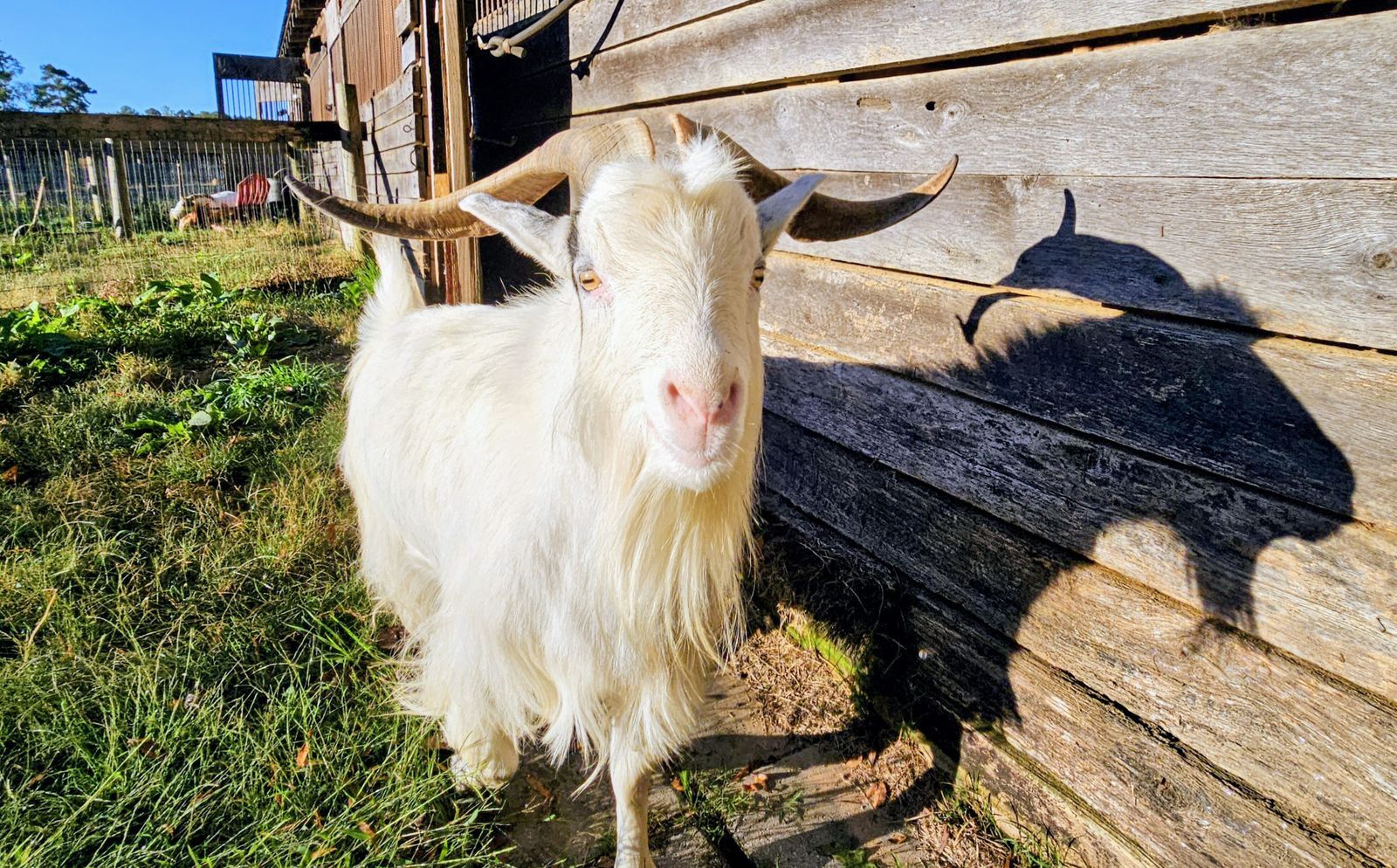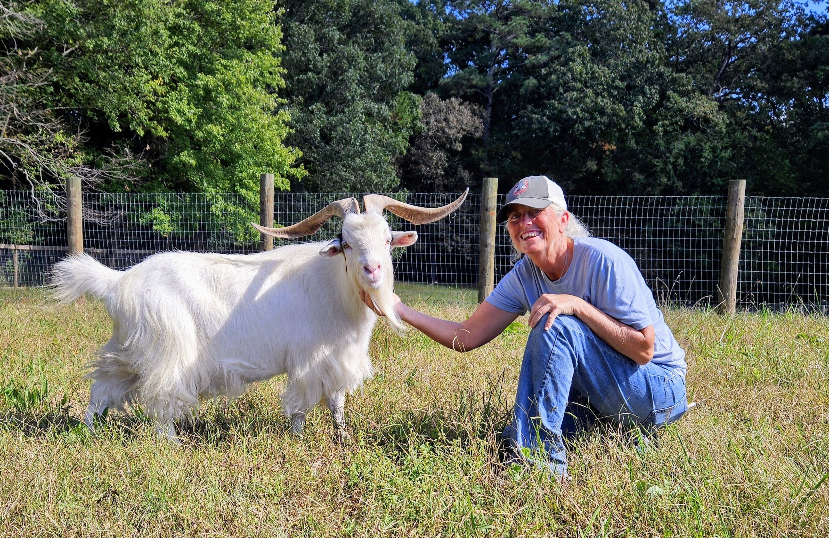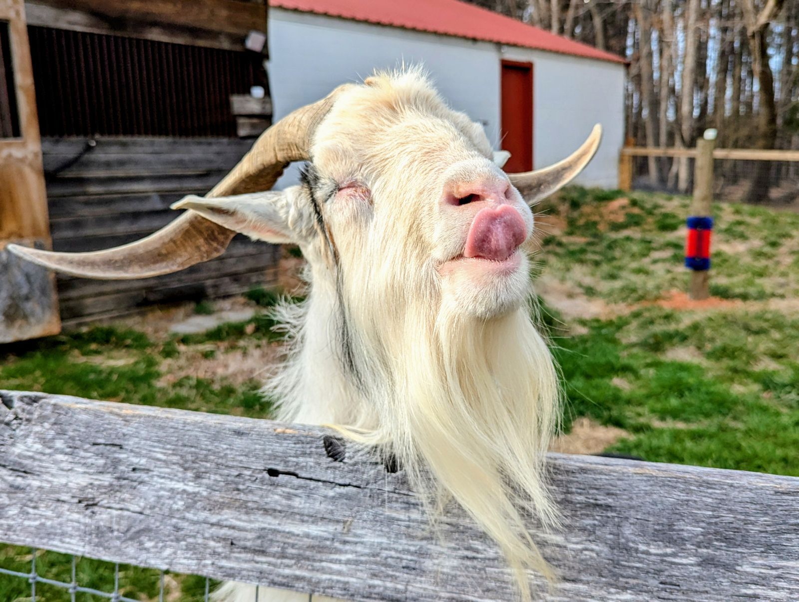 After visiting with him on 12 different days, we were finally able to capture him. You can watch his story below. His story was so compelling that Obi went viral on his 1st Rescuanniversary reaching over a million views and gaining us a lot of Obi followers. After we got him, we got him checked out, he was actually pretty darn healthy, and he got castrated at NC State. After coming home to the sanctuary, we still needed to quarantine him. It was an interesting first few months of him trying to escape here, knocking down fence posts etc. We then tried him with our herd of goats that we thought he would fit best however they are extremely bonded and the boys did not want another boy to join. As sweet as Obi is, when he decides to headbutt, it is with full force and extremely hard. As I know animals will work it out, I couldn't risk anyone getting hurt. And actually one of our goats who had a slightly compromised horn had it crack even more. He is okay but it would not be good for his horn to continue to be hit this hard.