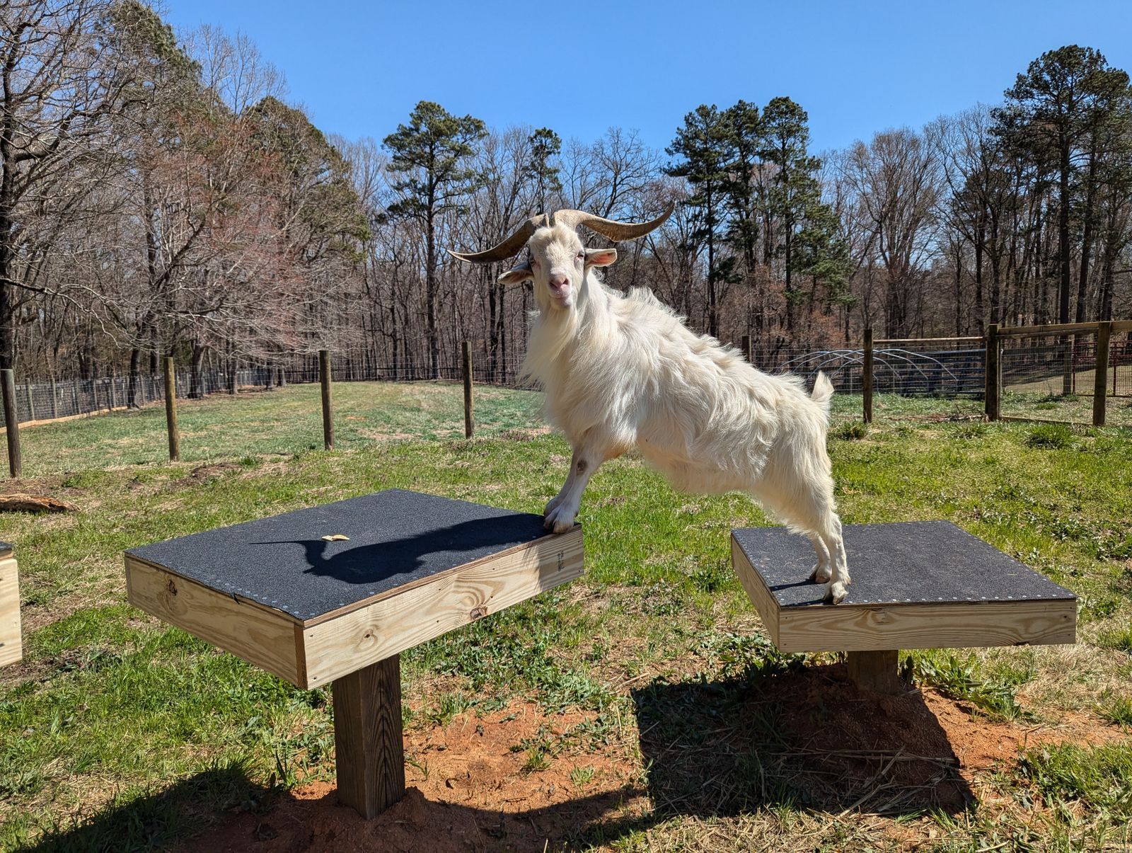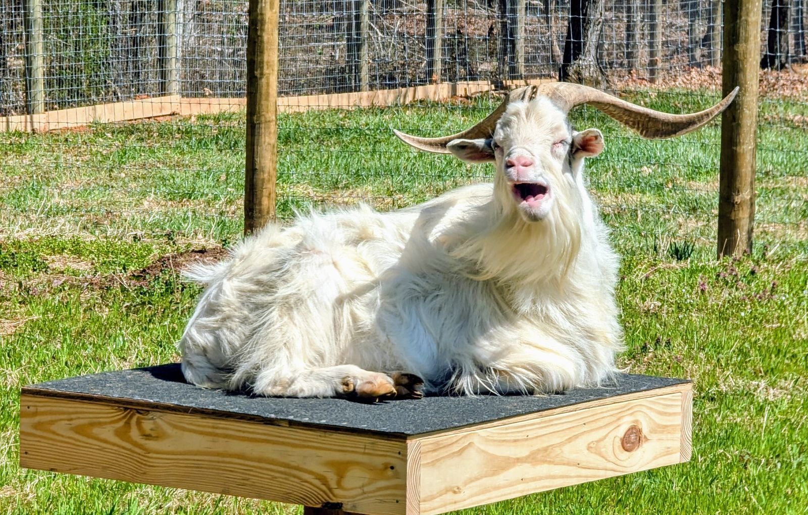 So after various trys to find Obi the perfect spot on the sanctuary (some of the animals find their spot immediately and others need a few trys), we created a brand new field adjacent to our woods so he would feel acclimated but with a very tall fence all around. He loves his field, he is connected to the barn so he has a big stall to go into during the day with a big fan in the summer and sees all our volunteers while they work in the barn, is next to all the goats at night and is surrounded by either the donkeys or horses nearby. One of the amazing families who took care of him helped build the pedestals in his field that he absolutely loves watching everything from. It took some time but Obi trusts me and allows me to pet and brush him. You still need to move slow but he loves to be loved on as well still loves his favorite goat treats.