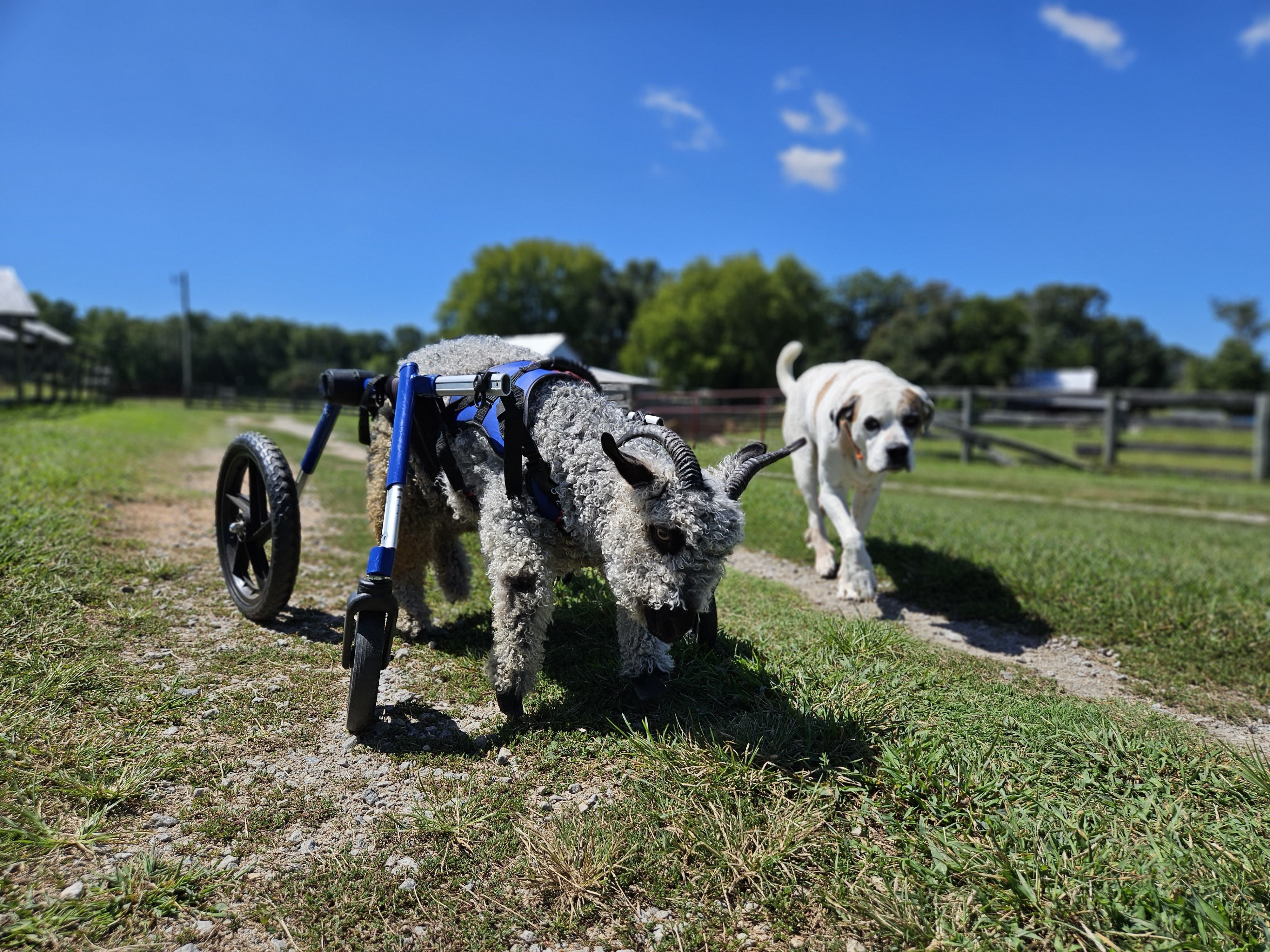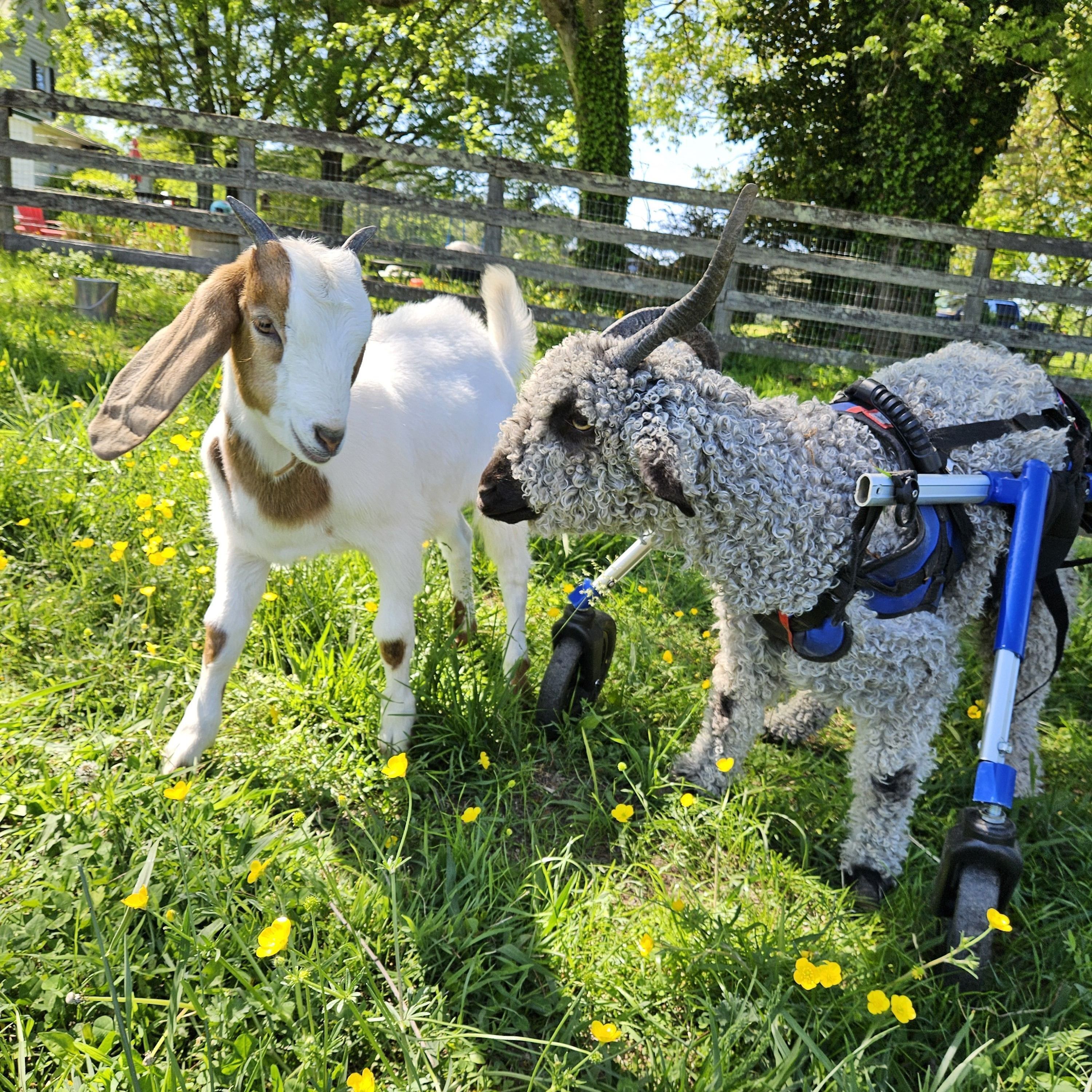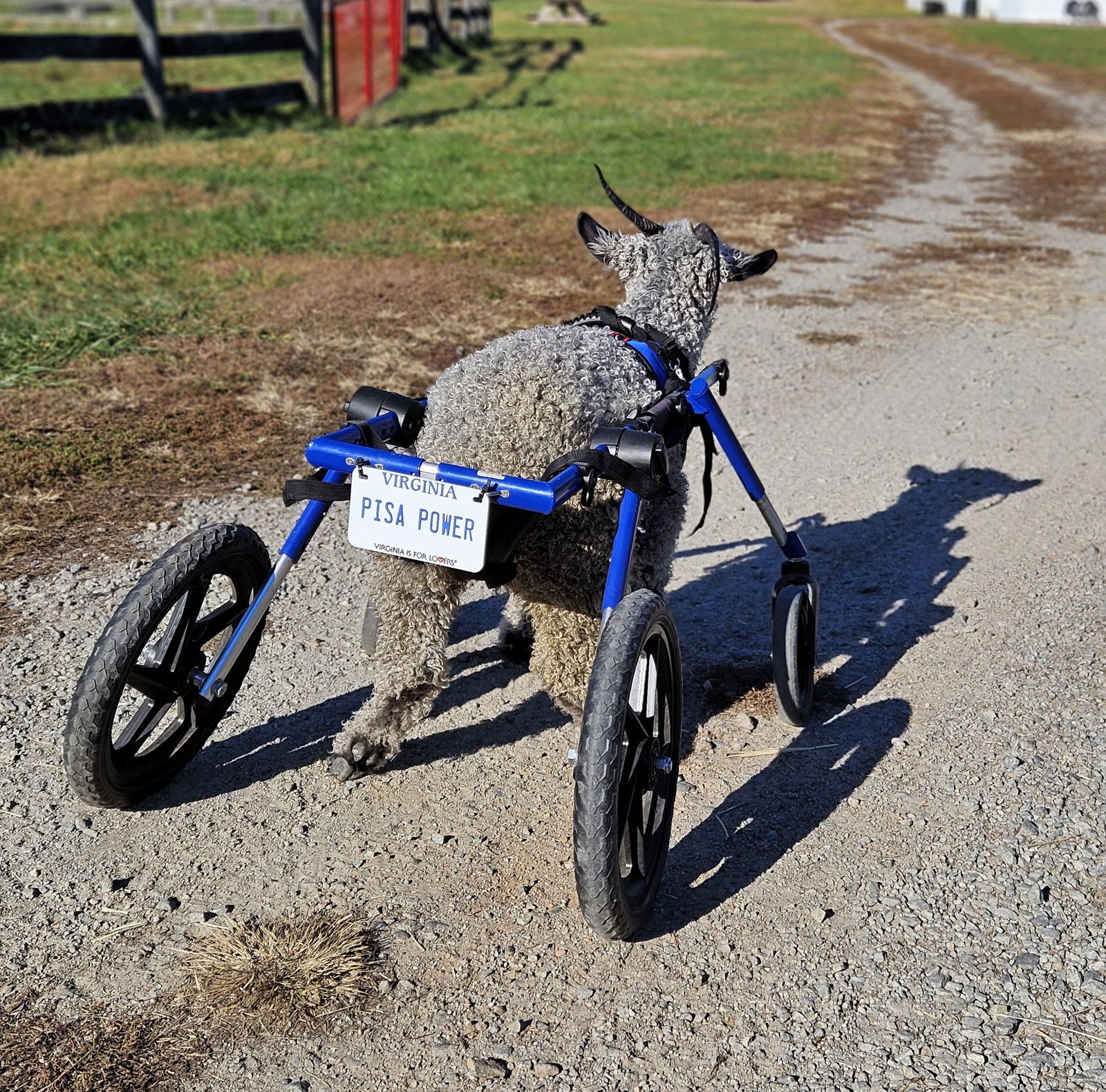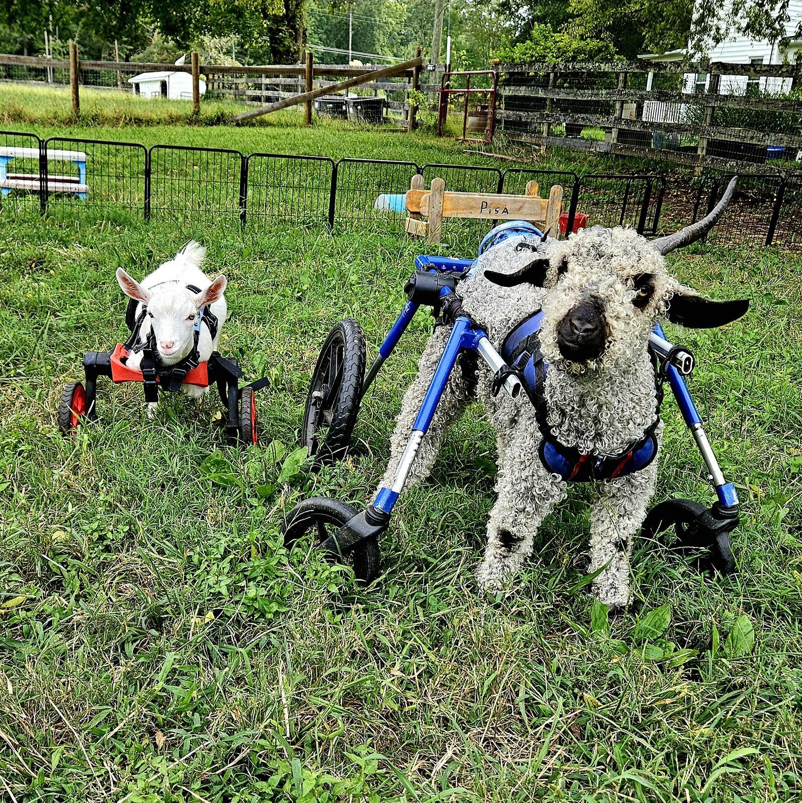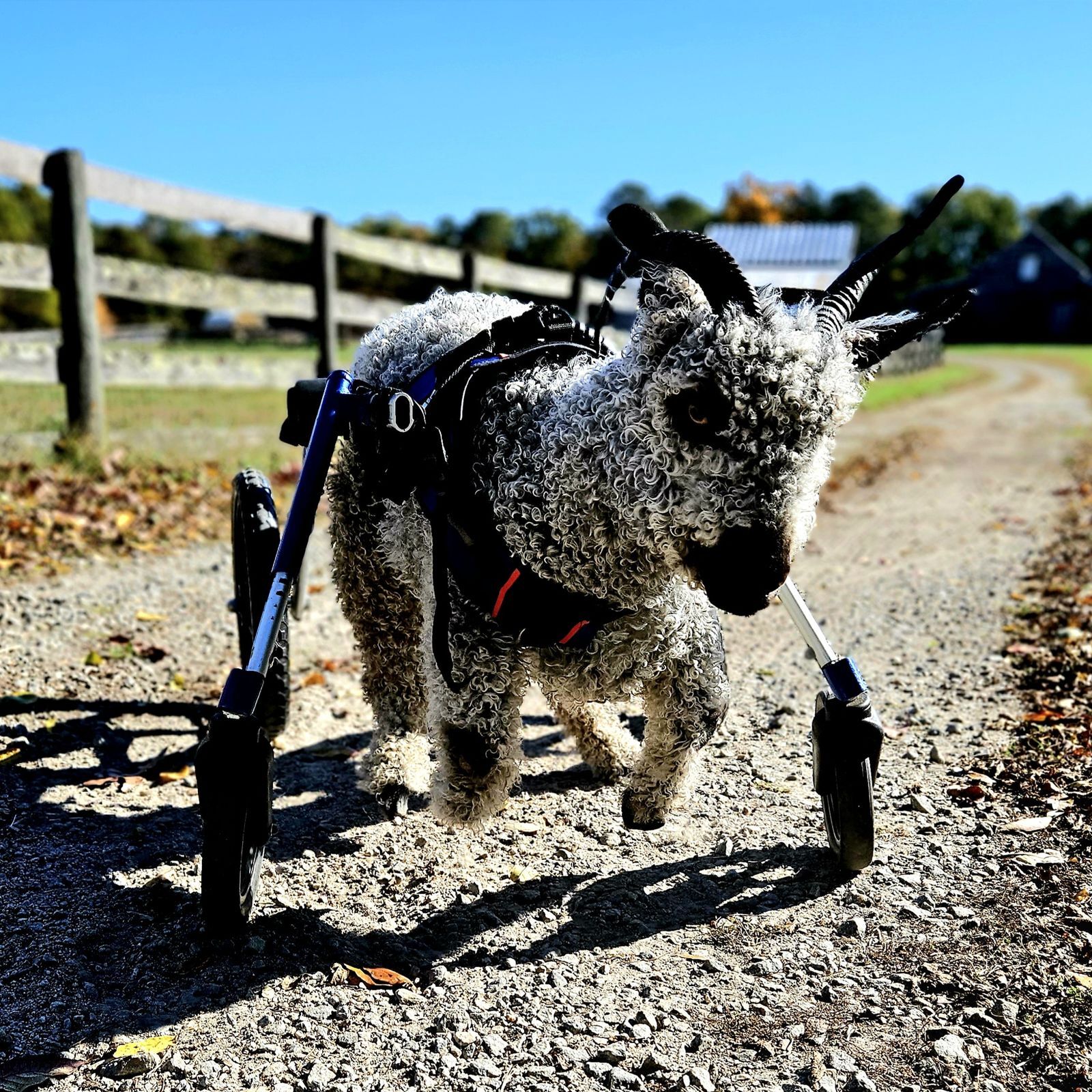 Pisa arrived in April 2022 at a month old. She is an angora goat and gets sheared like sheep do. She was born with neurological issues that does not allow her stand on her own. We were hoping she would be able to learn to balance like Tater and Tot were able however when she falls, she was never able to figure out how to get back up on her own. We have built several wood chutes that she can stand in on her own which allows her to ricochet off the boards on each side of her to balance herself. She is spunky, sweet, strong, and inspires us every day. We always say she has Pisa Power!! She works those little legs hard to fly around the farm. When she gets sheared, she looks like a different goat. She gets sheared 3x a year at least. Many people think she is a sheep but she is indeed a goat. Her curls are absolutely amazing and so soft. We are constantly working with Pisa to help her thrive and recently upgraded her cart to a customized cart from Bionic Pets. She doesn't know any different and is so happy and healthy otherwise. She is a little fighter and will always be my baby girl as she lived in the house for 2 years. She now bunks with Lucca in their own special barn where they each have a "room" as I call it. Her barn and field are right next to the house as we are constantly checking on both of them as well as bringing her hot water all day during the cooler months. We call her a little high maintenance :) but that's okay. Keeping her hydrated is a little bit of a job but so worth it.