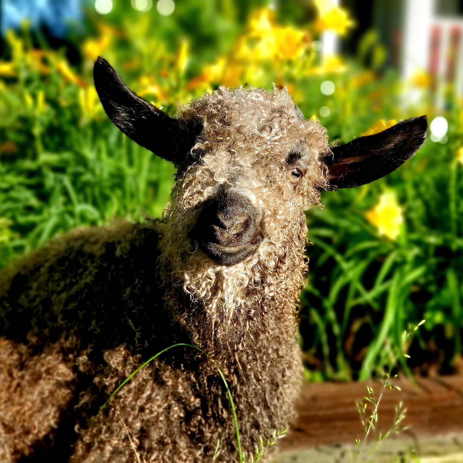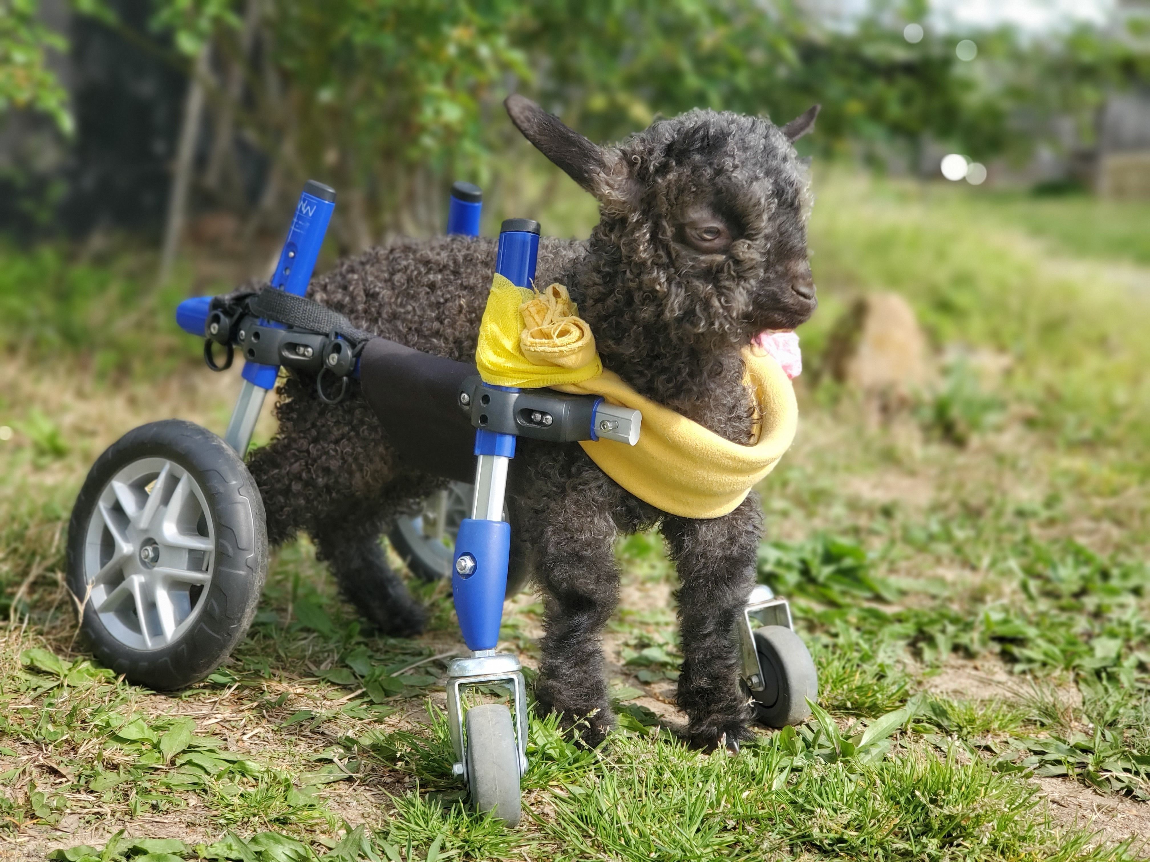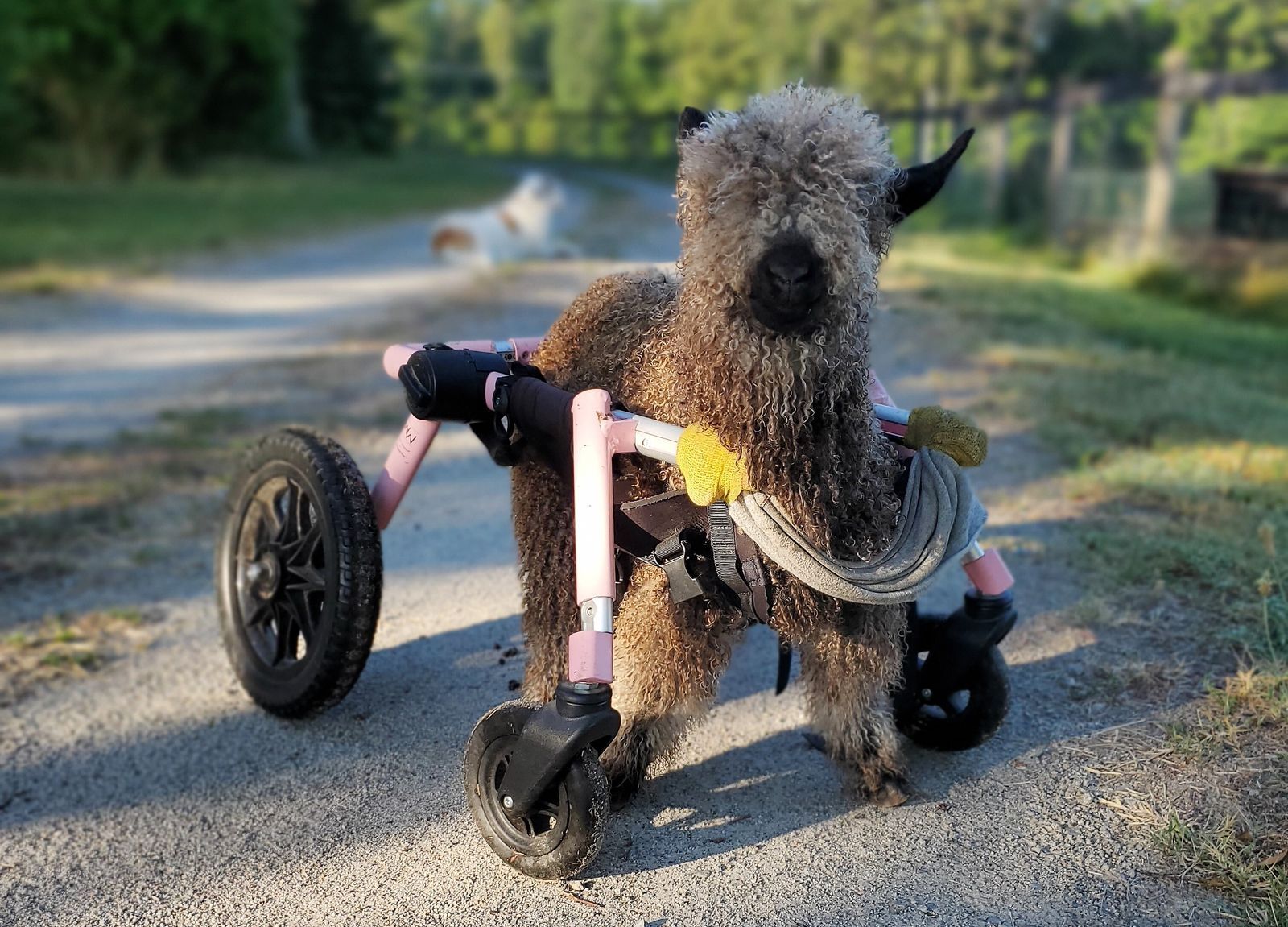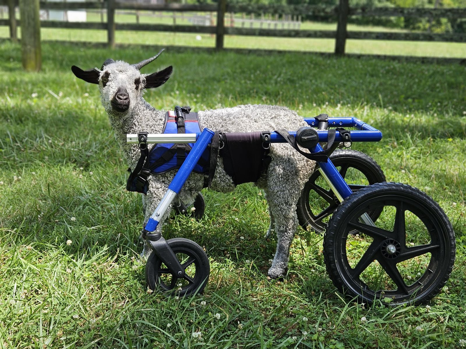 Pisa arrived in April 2022 at a month old. She is an angora goat and gets sheared like sheep do. She was born with neurological issues that does not allow her stand on her own. We were hoping she would be able to learn to balance like Tater and Tot were able however when she falls, she was never able to figure out how to get back up on her own. We have built several wood chutes that she can stand in on her own which allows her to ricochet off the boards on each side of her to balance herself. She is spunky, sweet, strong, and inspires us every day. We always say she has Pisa Power!! She works those little legs hard to fly around the farm. When she gets sheared, she looks like a different goat. She gets sheared 3x a year at least. Many people think she is a sheep but she is indeed a goat. Her curls are absolutely amazing and so soft. We are constantly working with Pisa to help her thrive and recently upgraded her cart to a customized cart from Bionic Pets. She doesn't know any different and is so happy and healthy otherwise. She is a little fighter and will always be my baby girl as she lived in the house for 2 years. She now bunks with Lucca in their own special barn where they each have a "room" as I call it. Her barn and field are right next to the house as we are constantly checking on both of them as well as bringing her hot water all day during the cooler months. We call her a little high maintenance :) but that's okay. Keeping her hydrated is a little bit of a job but so worth it.