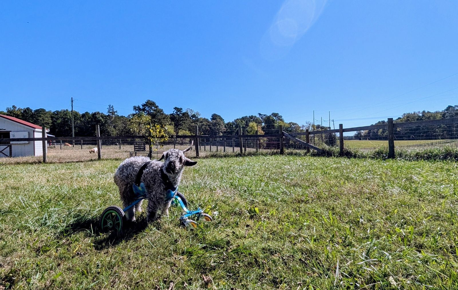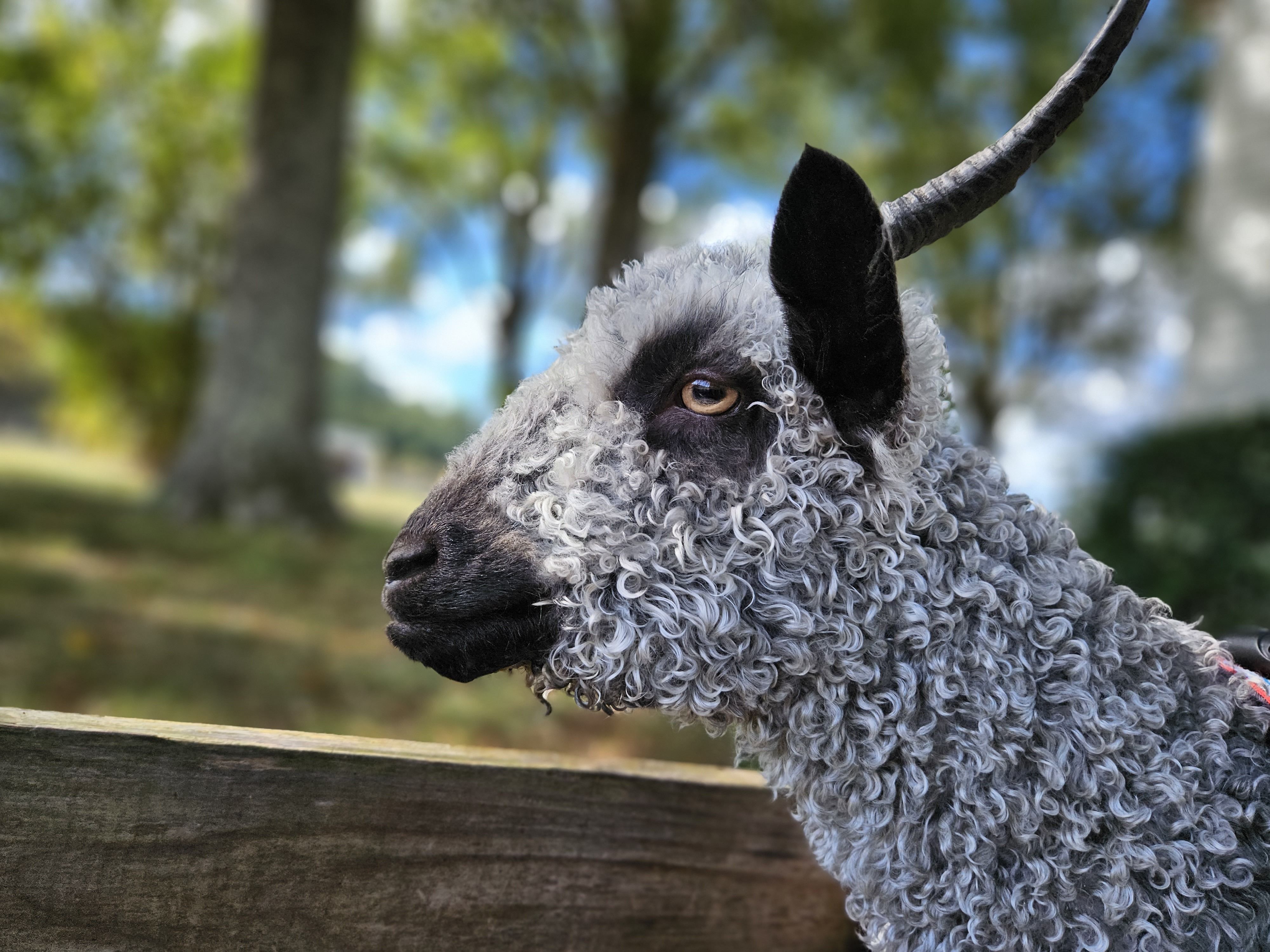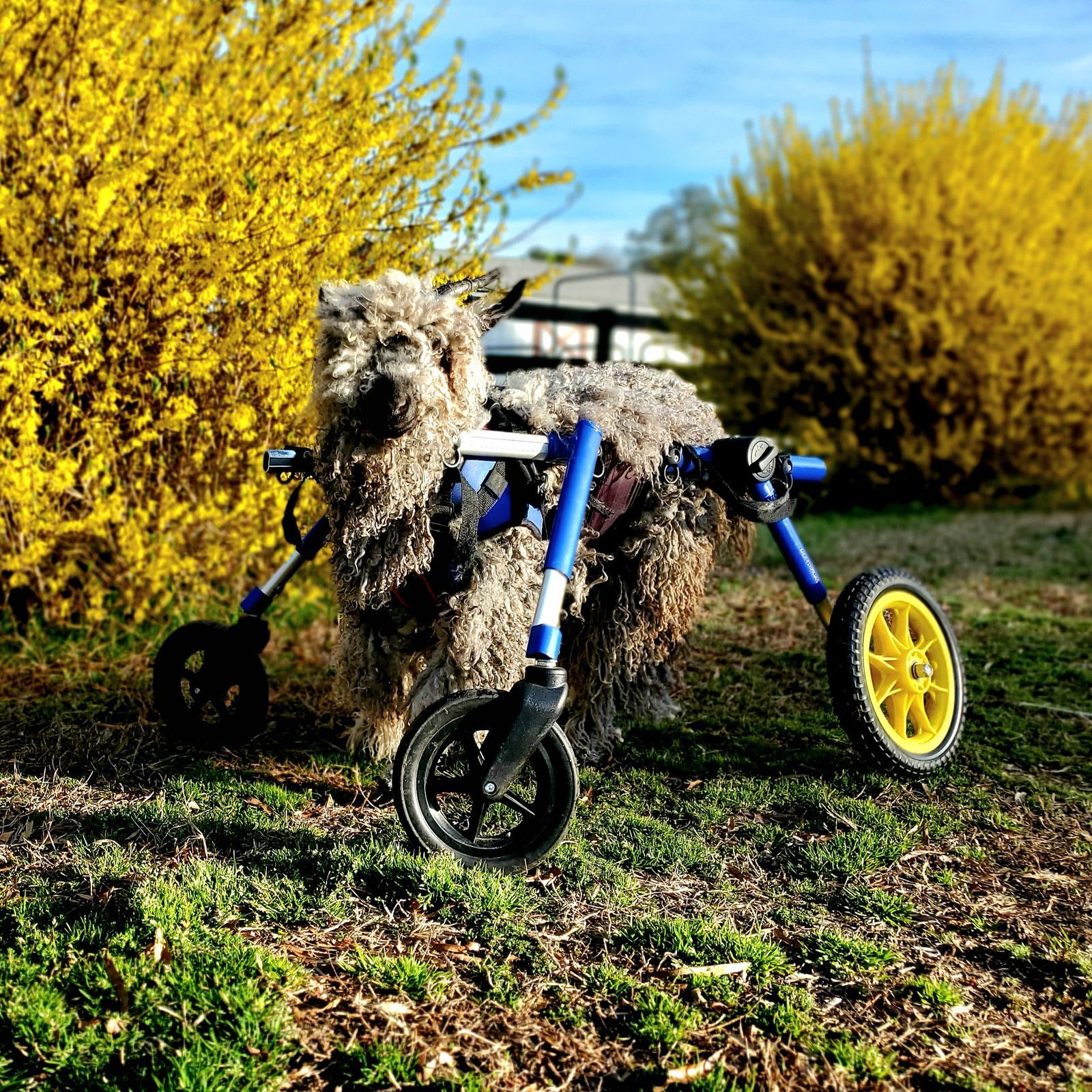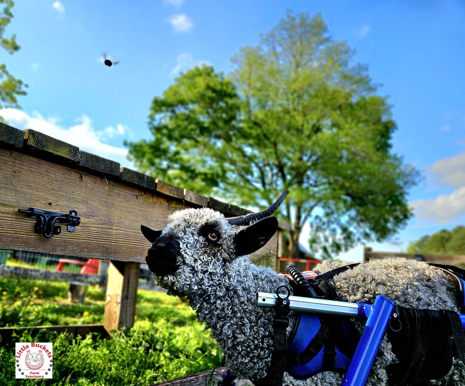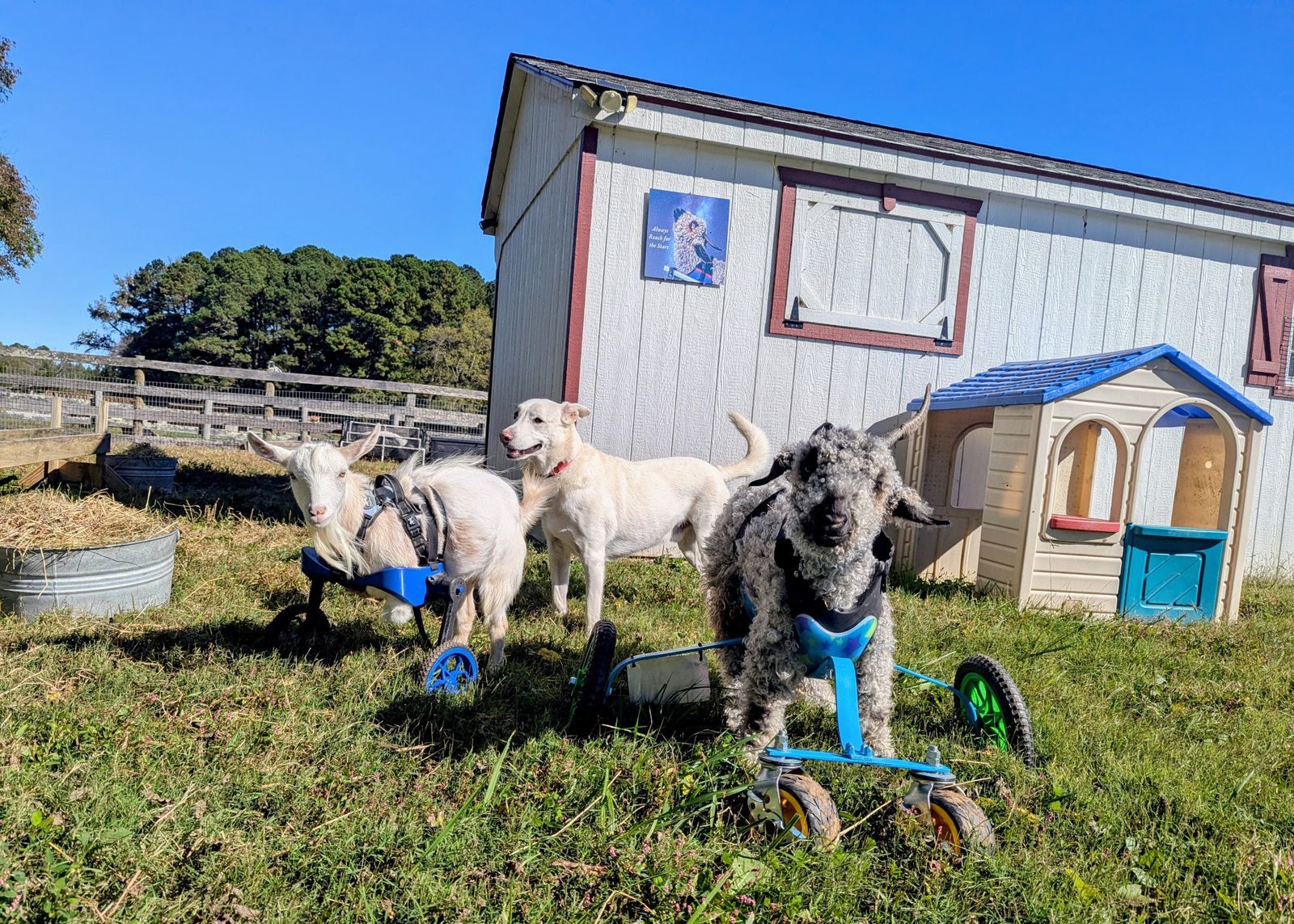 Pisa arrived in April 2022 at a month old. She is an angora goat and gets sheared like sheep do. She was born with neurological issues that does not allow her stand on her own. We were hoping she would be able to learn to balance like Tater and Tot were able however when she falls, she was never able to figure out how to get back up on her own. We have built several wood chutes that she can stand in on her own which allows her to ricochet off the boards on each side of her to balance herself. She is spunky, sweet, strong, and inspires us every day. We always say she has Pisa Power!! She works those little legs hard to fly around the farm. When she gets sheared, she looks like a different goat. She gets sheared 3x a year at least. Many people think she is a sheep but she is indeed a goat. Her curls are absolutely amazing and so soft. We are constantly working with Pisa to help her thrive and recently upgraded her cart to a customized cart from Bionic Pets. She doesn't know any different and is so happy and healthy otherwise. She is a little fighter and will always be my baby girl as she lived in the house for 2 years. She now bunks with Lucca in their own special barn where they each have a "room" as I call it. Her barn and field are right next to the house as we are constantly checking on both of them as well as bringing her hot water all day during the cooler months. We call her a little high maintenance :) but that's okay. Keeping her hydrated is a little bit of a job but so worth it.