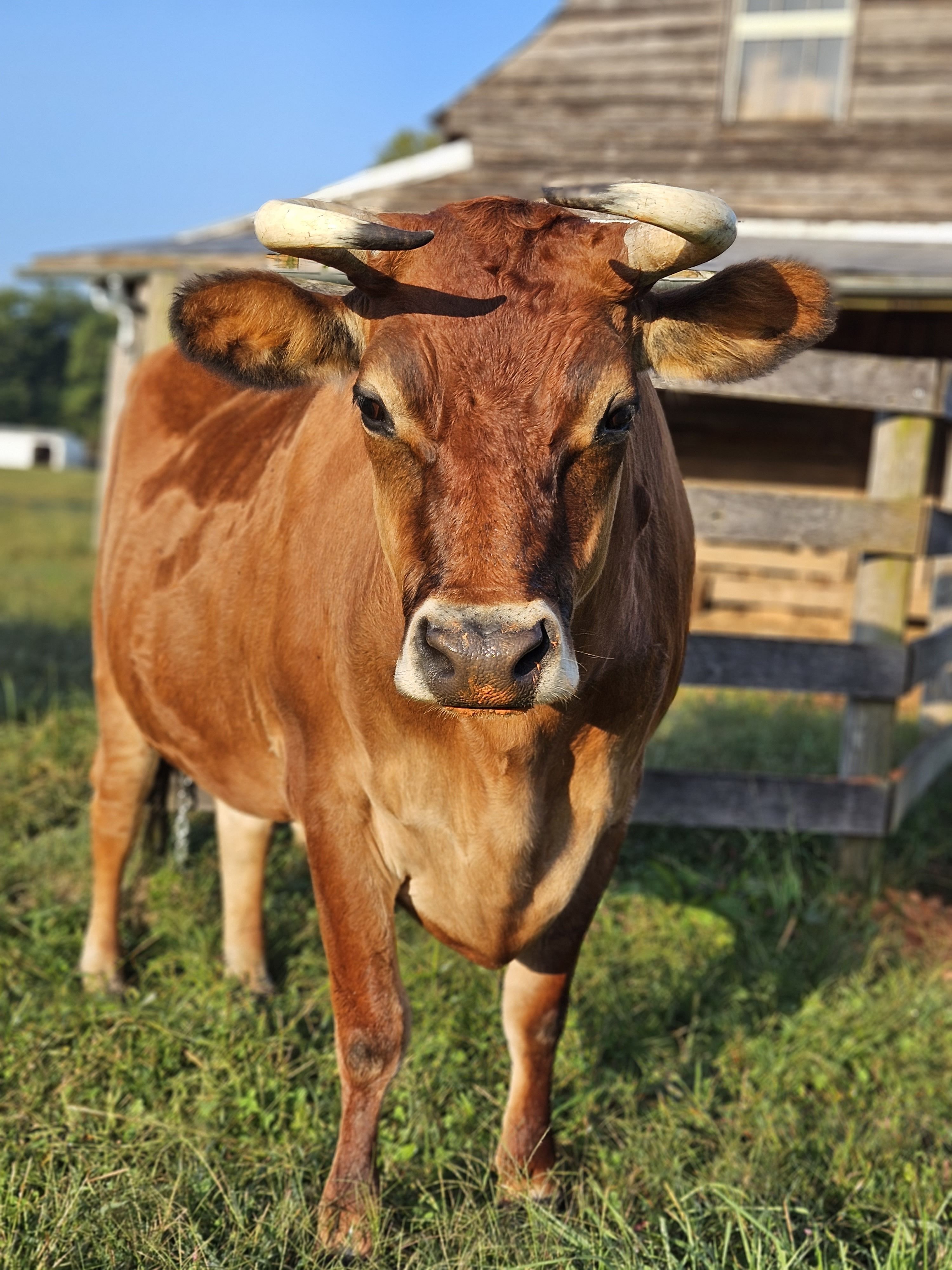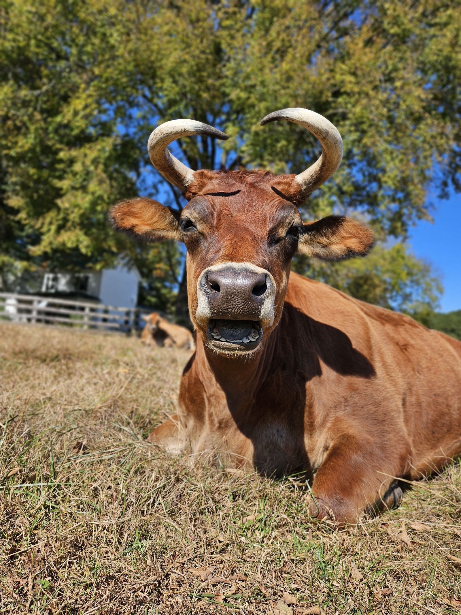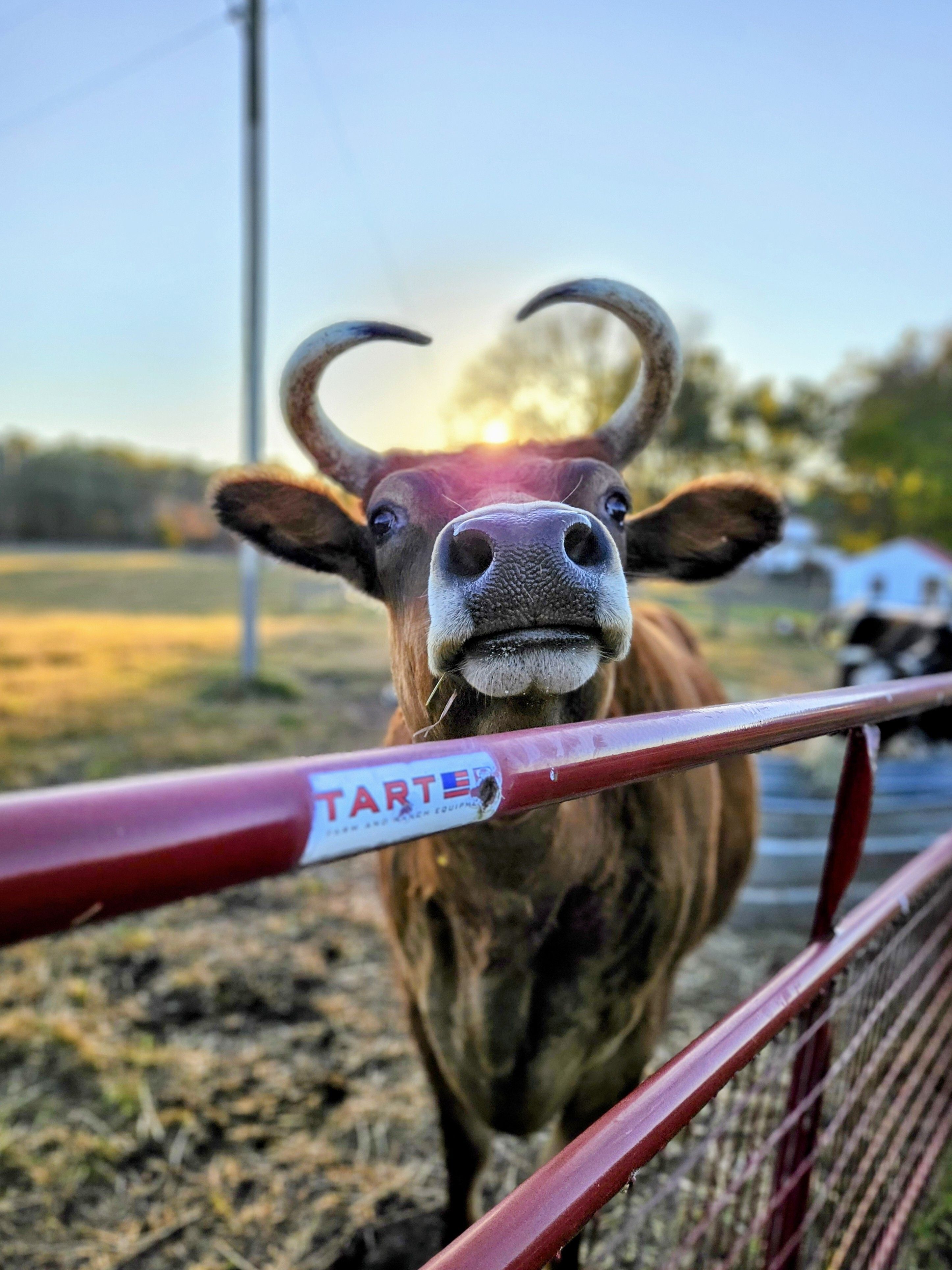 I was contacted very early in 2019 by Jason Bolalek who lived in Vermont and who later formed Destination Liberation and was wanting to save the male calves at several dairy farms nearby as he had gotten the farms to agree to surrender them as they are no use to dairy farms sadly. A few months later and we were ready and Jason drove Journey a week old (along with Miles) from Vermont to Virginia in the back seat of his sedan. Jason named the boys after the trip. The boys had just been ripped from their mother and instantly befriended each other for comfort. The trip took it's toll as both fought scours and fevers but they fought hard and got well. They were both bottle fed and moved from being in a quarantine field to one of the goat fields until they were big enough to be in with Bucket and Bailey. They would literally moo to each other. Once they were together, they all got along great. Journey has the best moo and is very talkative along with beautiful horns. He is incredibly handsome. We love him so much!