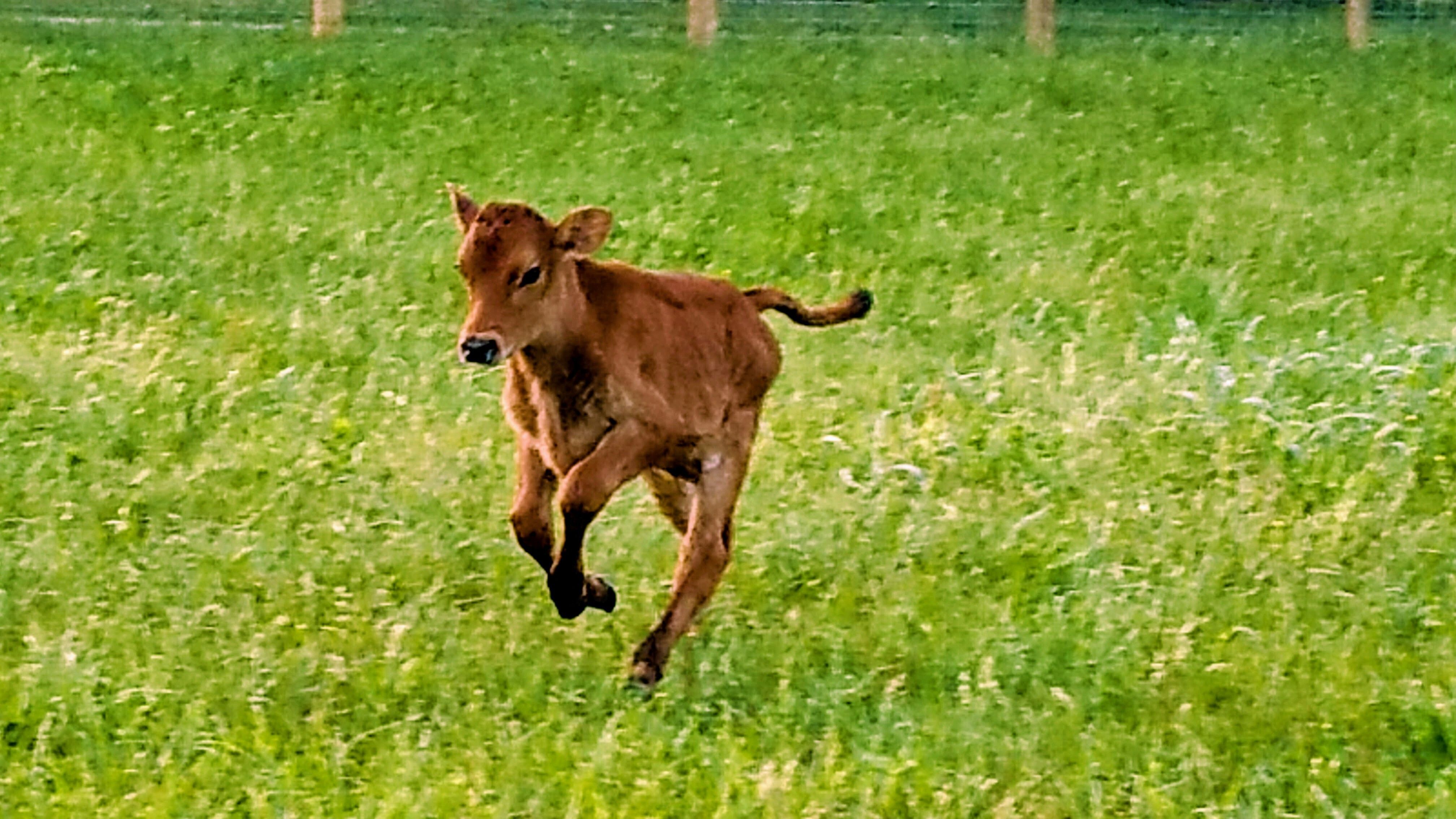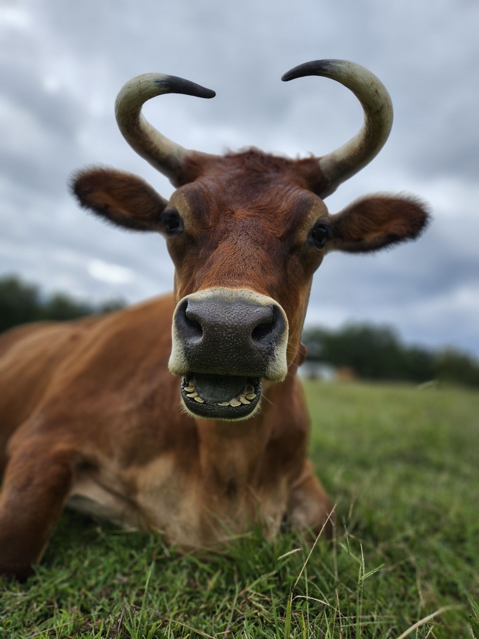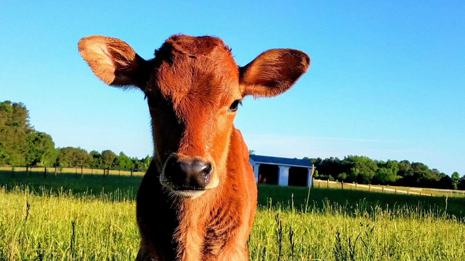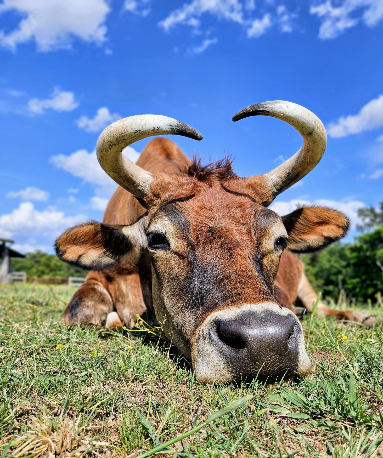 I was contacted very early in 2019 by Jason Bolalek who lived in Vermont and who later formed Destination Liberation and was wanting to save the male calves at several dairy farms nearby as he had gotten the farms to agree to surrender them as they are no use to dairy farms sadly. A few months later and we were ready and Jason drove Journey a week old (along with Miles) from Vermont to Virginia in the back seat of his sedan. Jason named the boys after the trip. The boys had just been ripped from their mother and instantly befriended each other for comfort. The trip took it's toll as both fought scours and fevers but they fought hard and got well. They were both bottle fed and moved from being in a quarantine field to one of the goat fields until they were big enough to be in with Bucket and Bailey. They would literally moo to each other. Once they were together, they all got along great. Journey has the best moo and is very talkative along with beautiful horns. He is incredibly handsome. We love him so much!