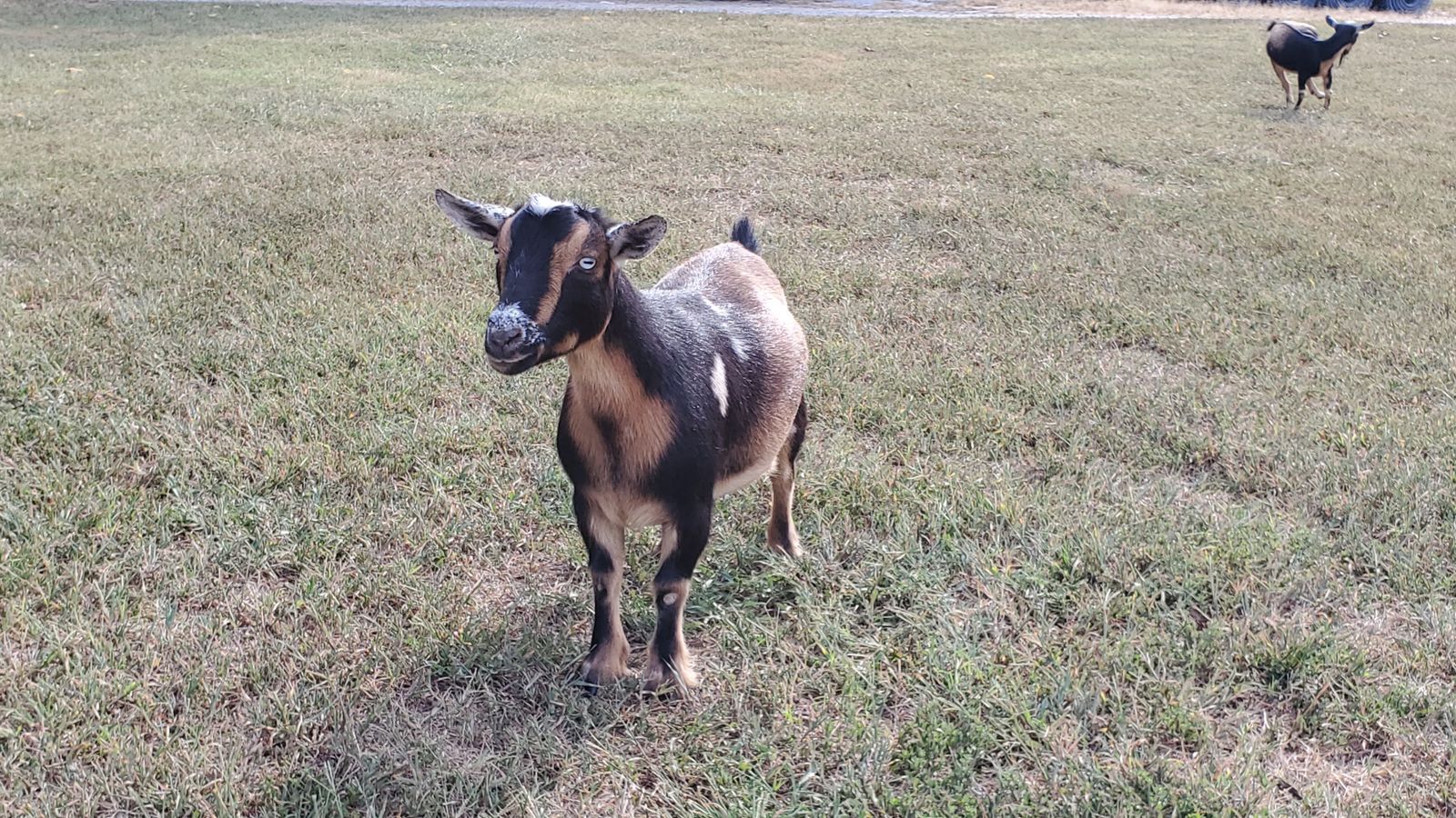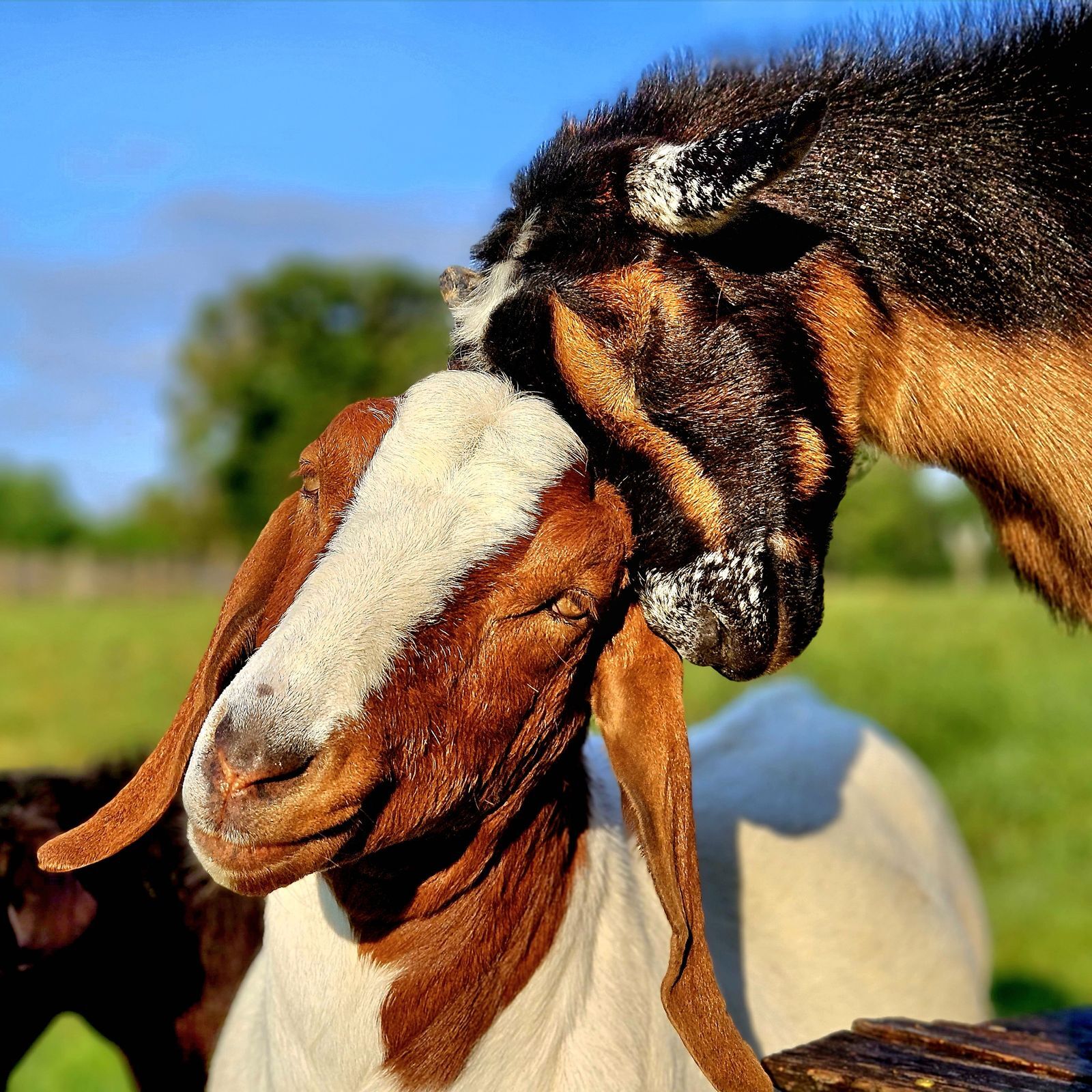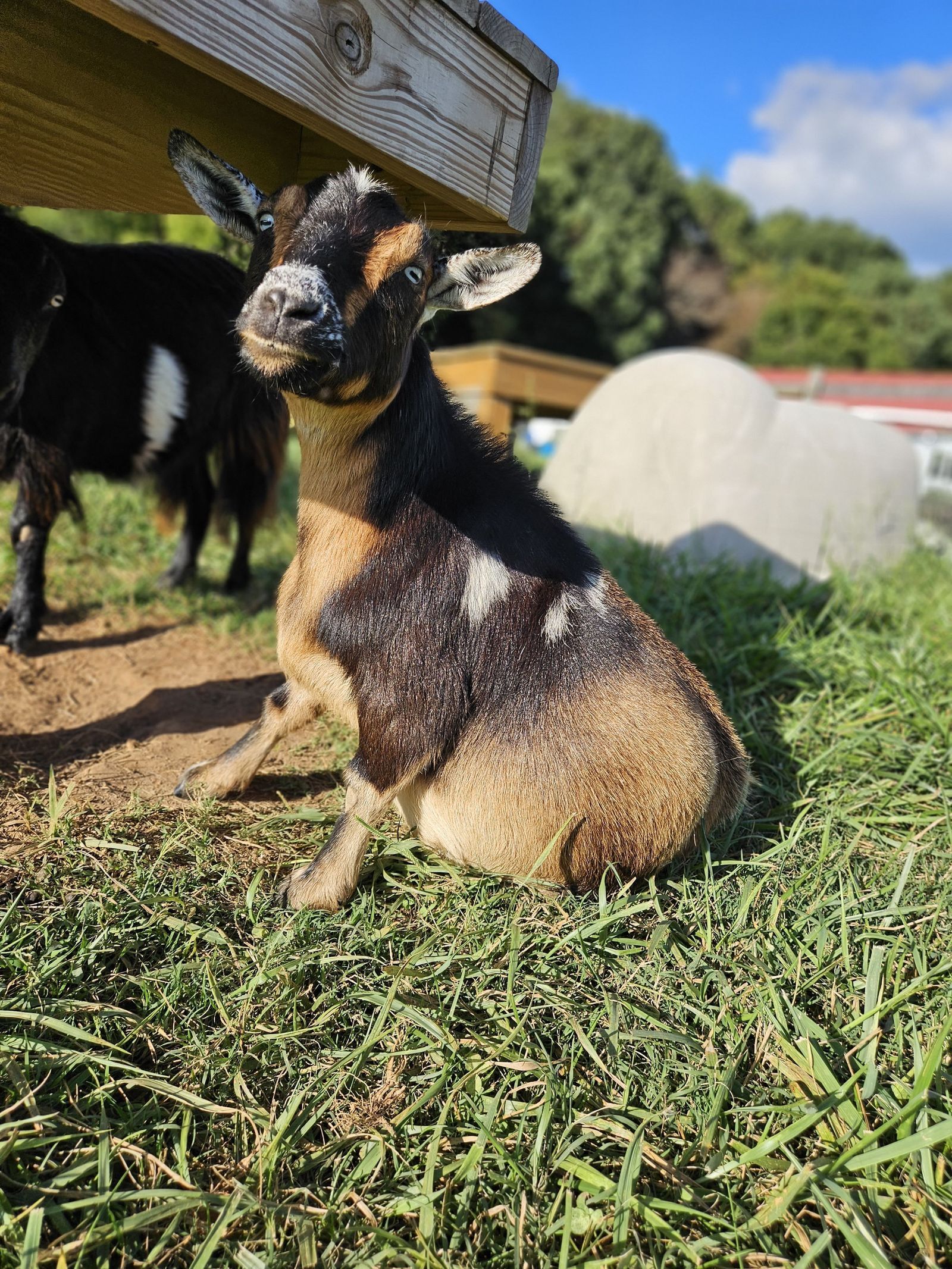 Penny was also rescued from a vet school by a student who had already saved her friend Sprinkles who had issues with her back legs but who was still able to walk. This vet school student reached out to Lawson's Heart (IG account where special needs animals are posted to find homes) to see if she could find a sanctuary for both Penny and Sprinkles as she did not have a farm but who loved Penny and Sprinkles tremendously. She wanted them to have a big field and other goat friends. So Penny and Sprinkles came to us in July 2019. Sadly Sprinkles passed away a few months later and Penny was left without her best friend. She is incredibly sweet and quiet and has slowly befriended Hopie, Blondie and the rest of the gang who she spends her time with. Penny found her place on the farm and was truly friends with everyone. She remained a little shy but brought so many smiles to us.
