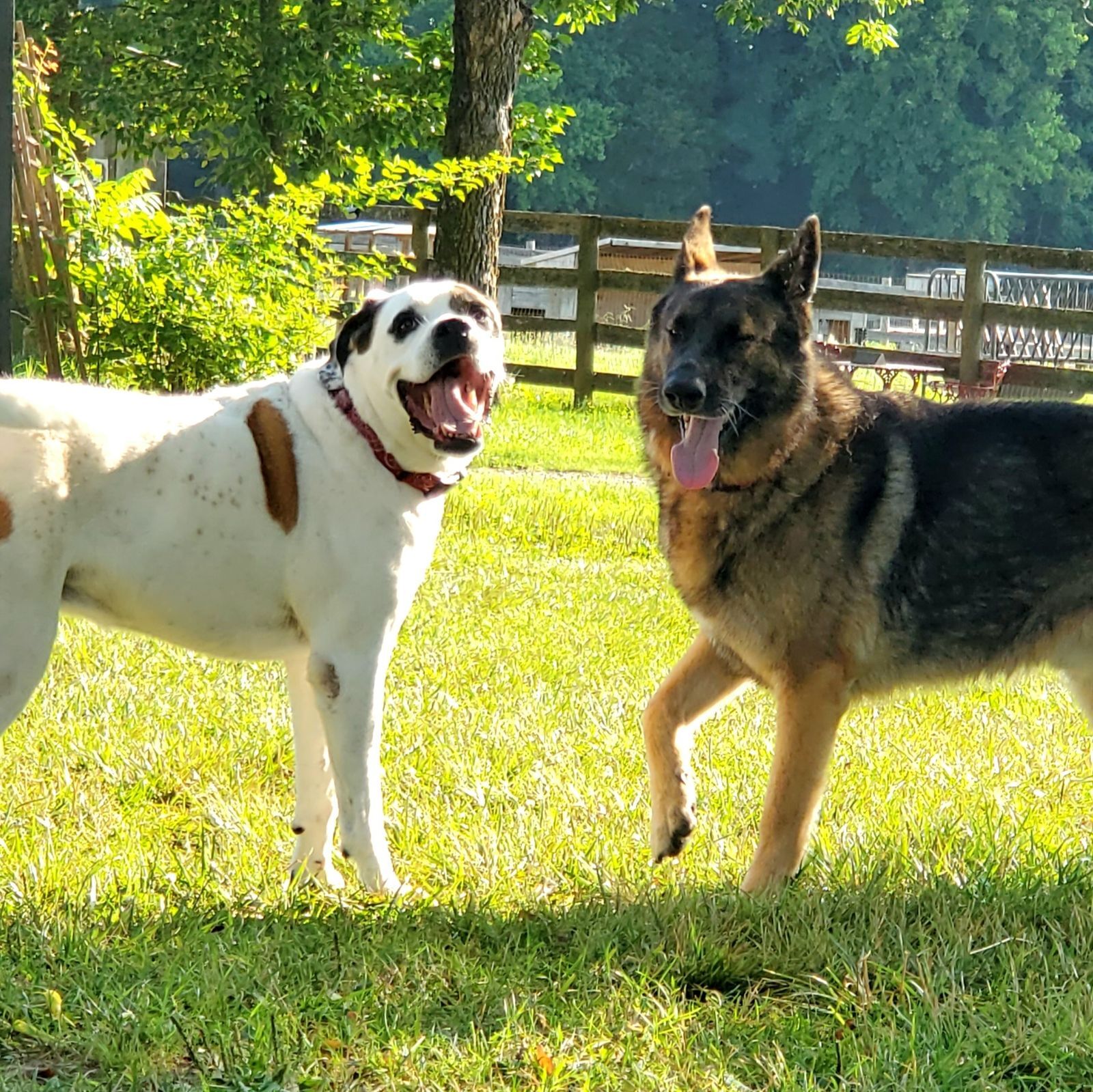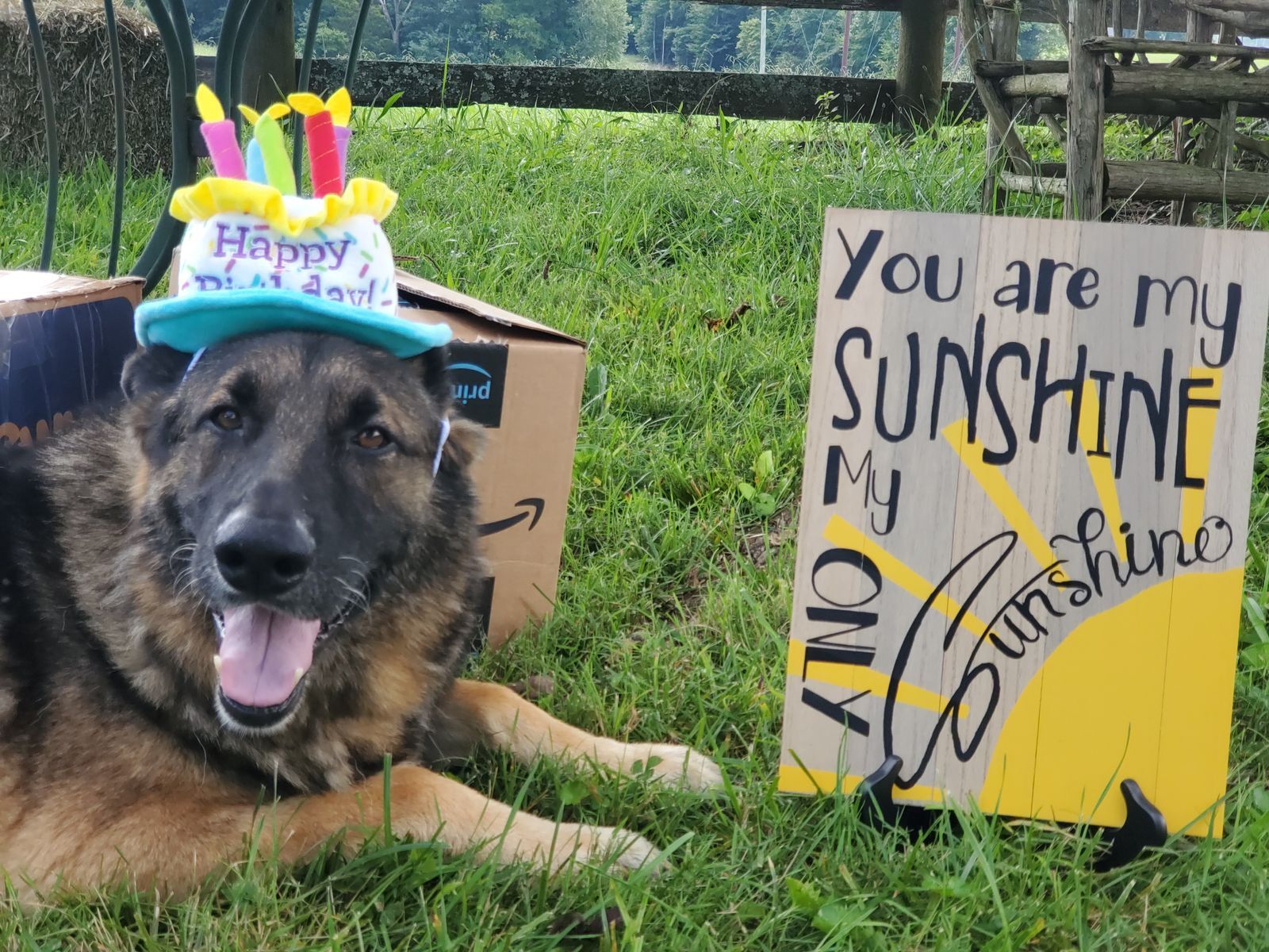 We welcomed Sundance aka Sunny in February 2021! Sunny was being fostered by one of my friends/volunteers who was fostering for a rescue near her. She always posted a lot about her fosters and when she posted Sunny, I immediately fell in love. Being a German Shepherd, I thought he would get scooped right up and adopted. Since I always try to help animals who would not have a good chance of being helped otherwise, I waited a couple of weeks. Sunny was showing some hip issues and was heartworm positive and that deterred several adopters. It did not deter us. So Sunny was brought to the farm for a meet and greet with Colton and it could not have gone better. He was perfect with her and was truly the absolute sweetest. He didn't have any right to be sweet as humans had let him down but this boy was all heart and kindness. He loved being on the farm more than I could ever explain. He took on the job so well of looking after Tidbit and Polly who were babies at the time.